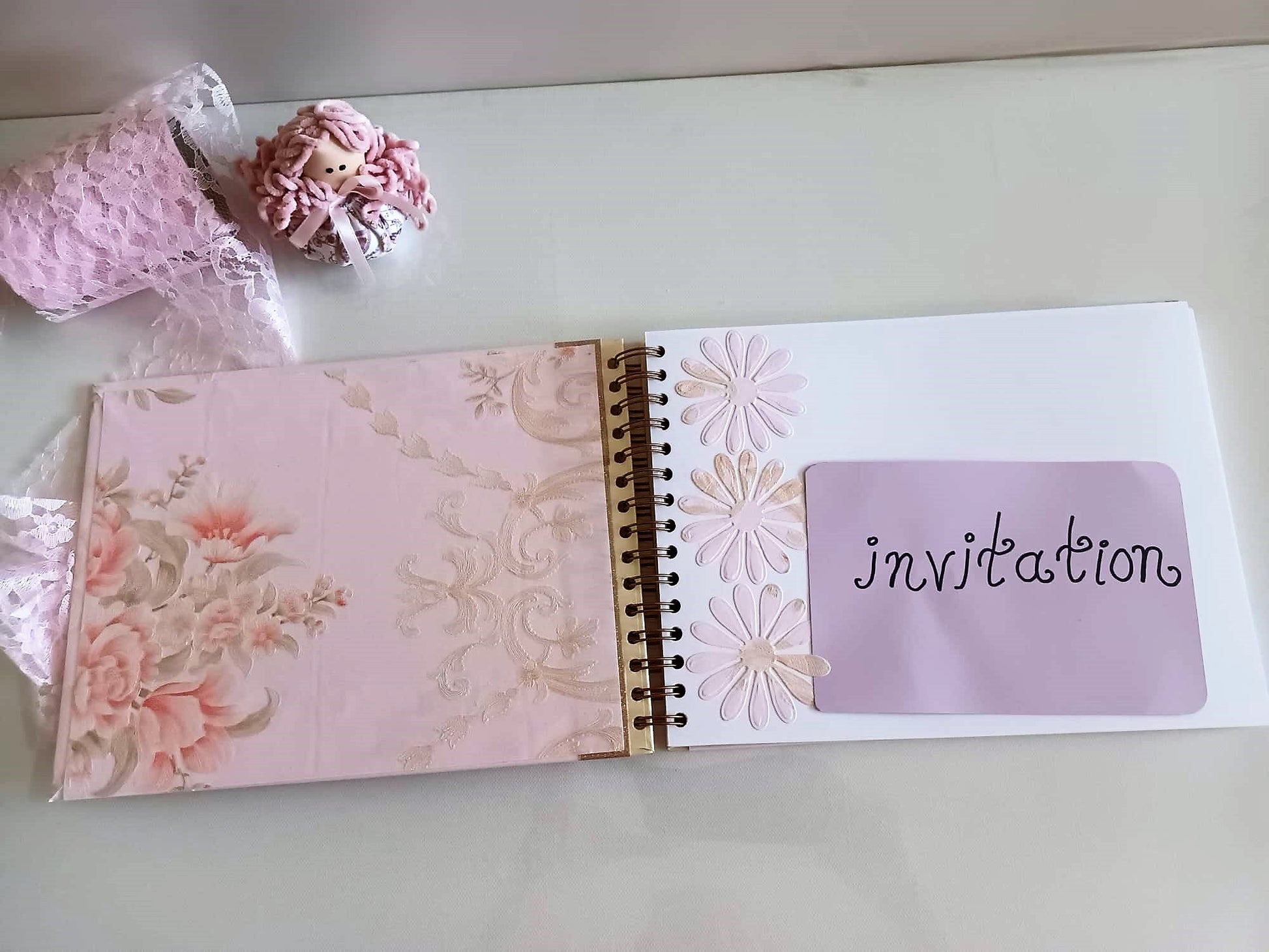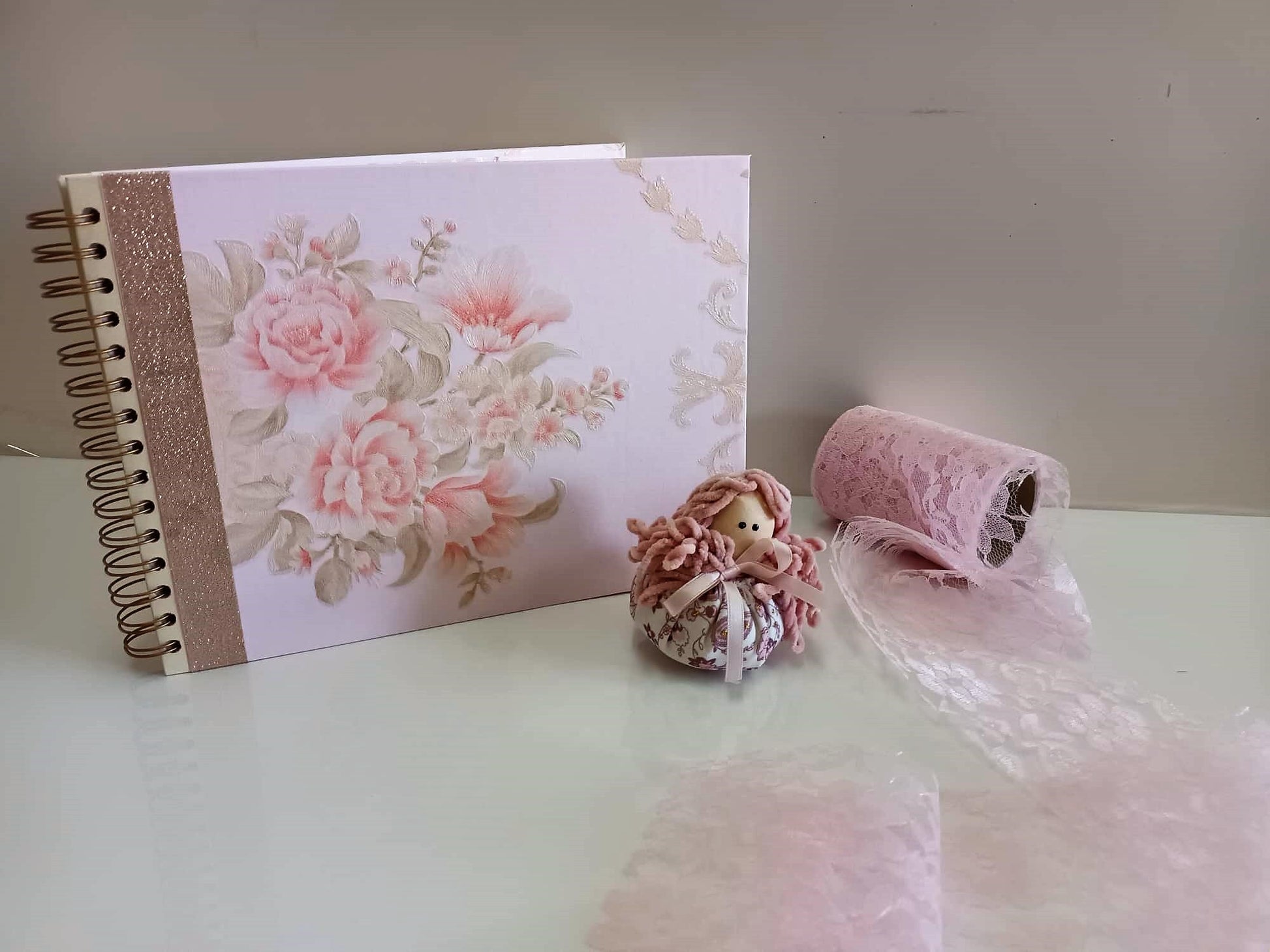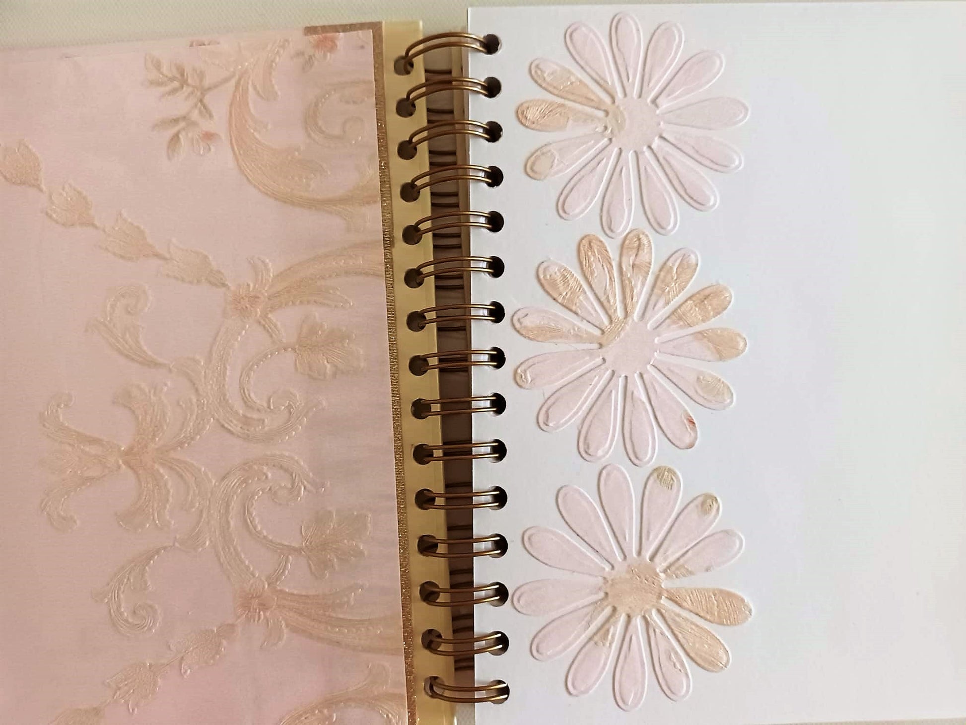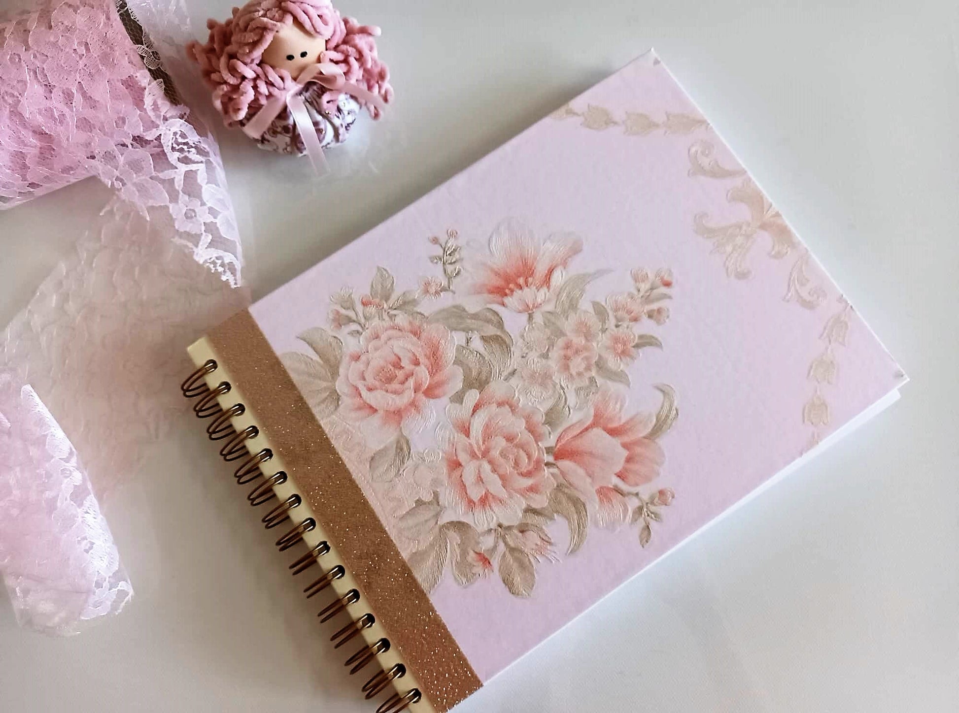 The book consists of 40 sheets (27cm X 20cm) of 200 gr paper. It is decorated with a beautiful pale floral pink fabric paper.