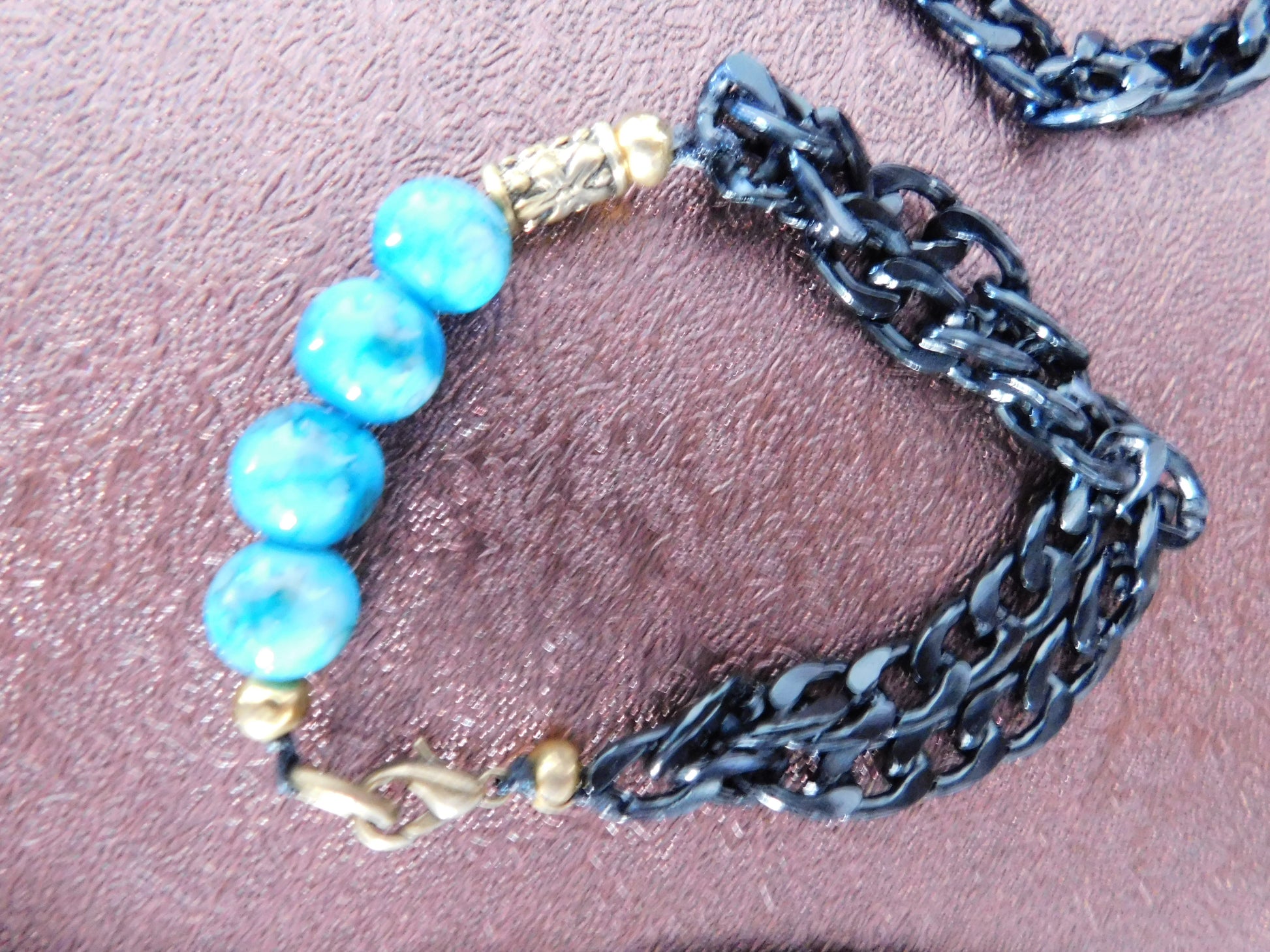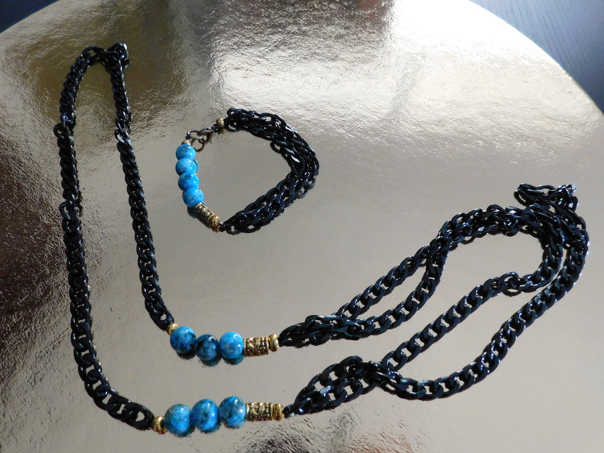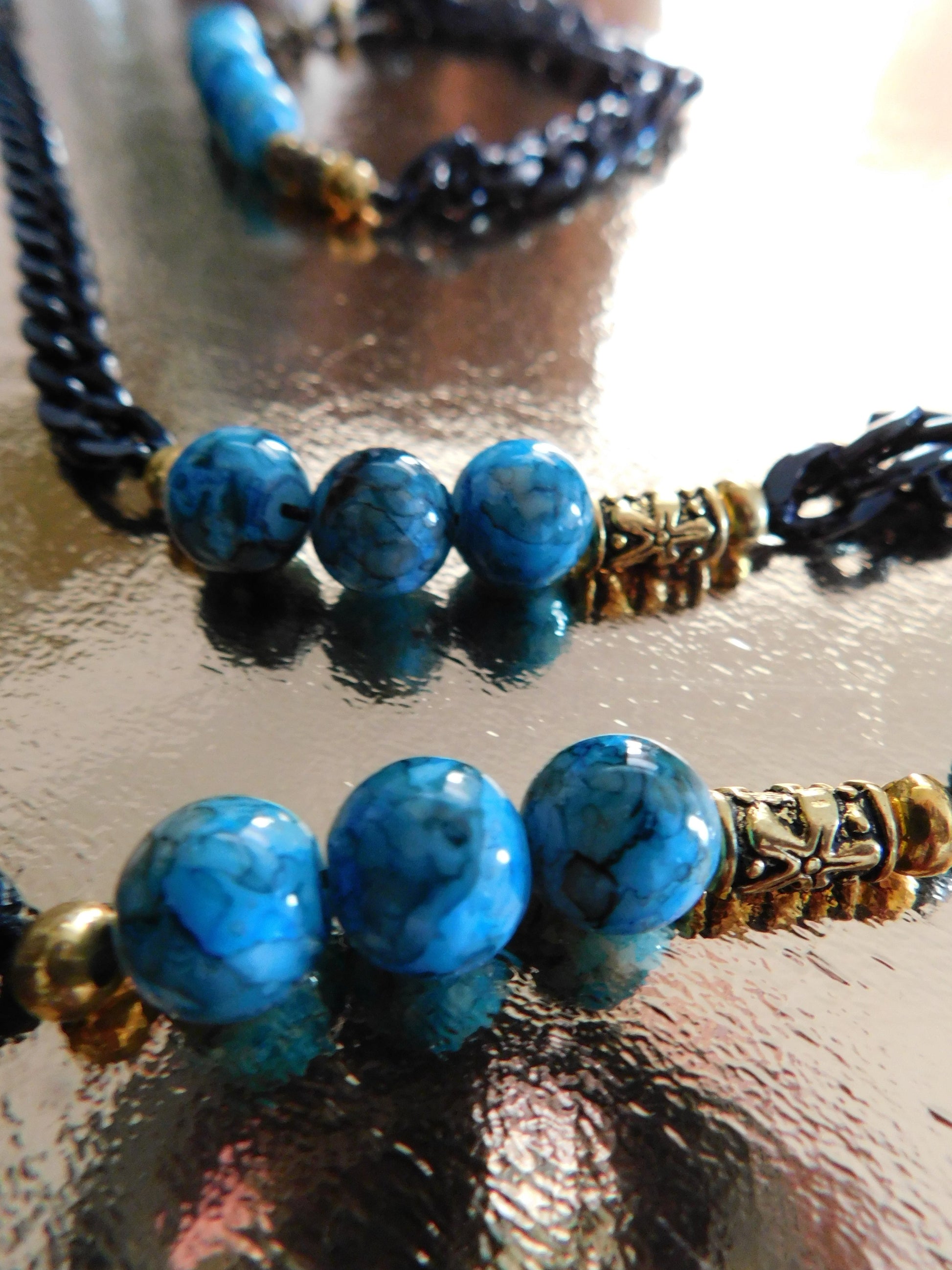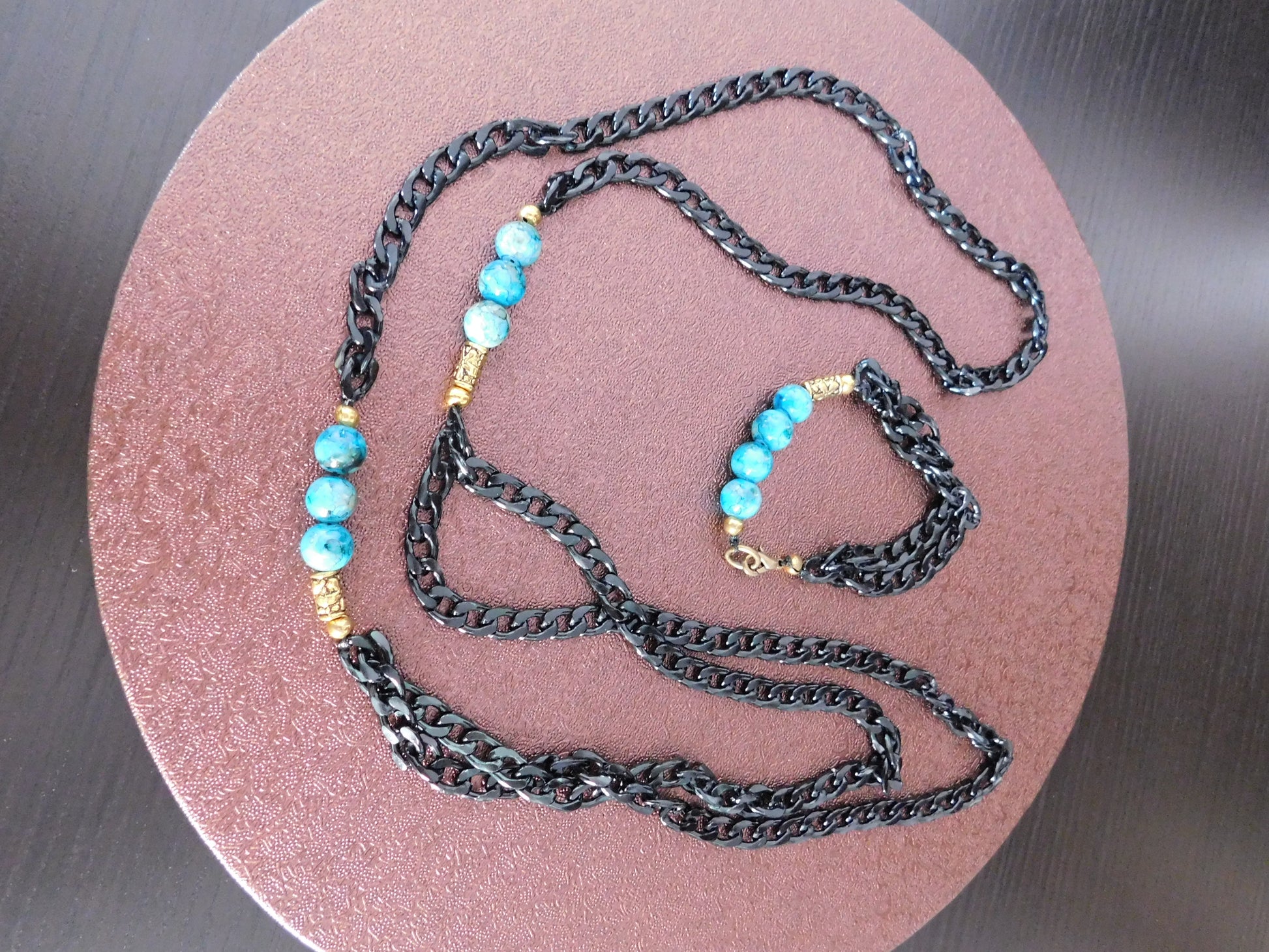 Long necklace with black thick chain and sky blue marble textured beads. The upper part of the chain is single, while the bottom part consists of two layers of black chain in different lengths. The blue beads are joint to the chain with golden spacers.