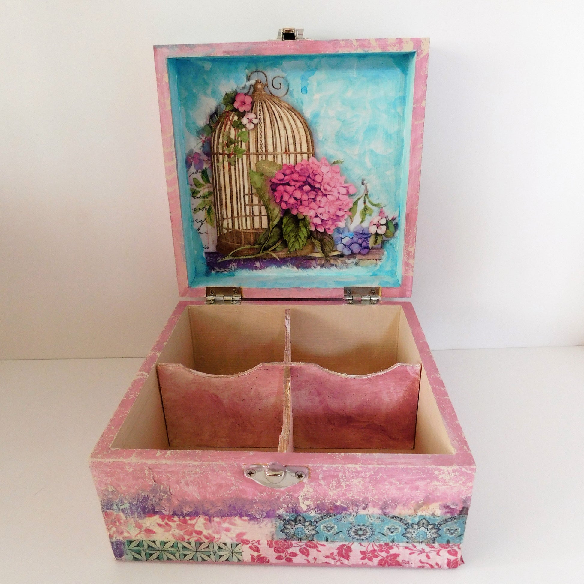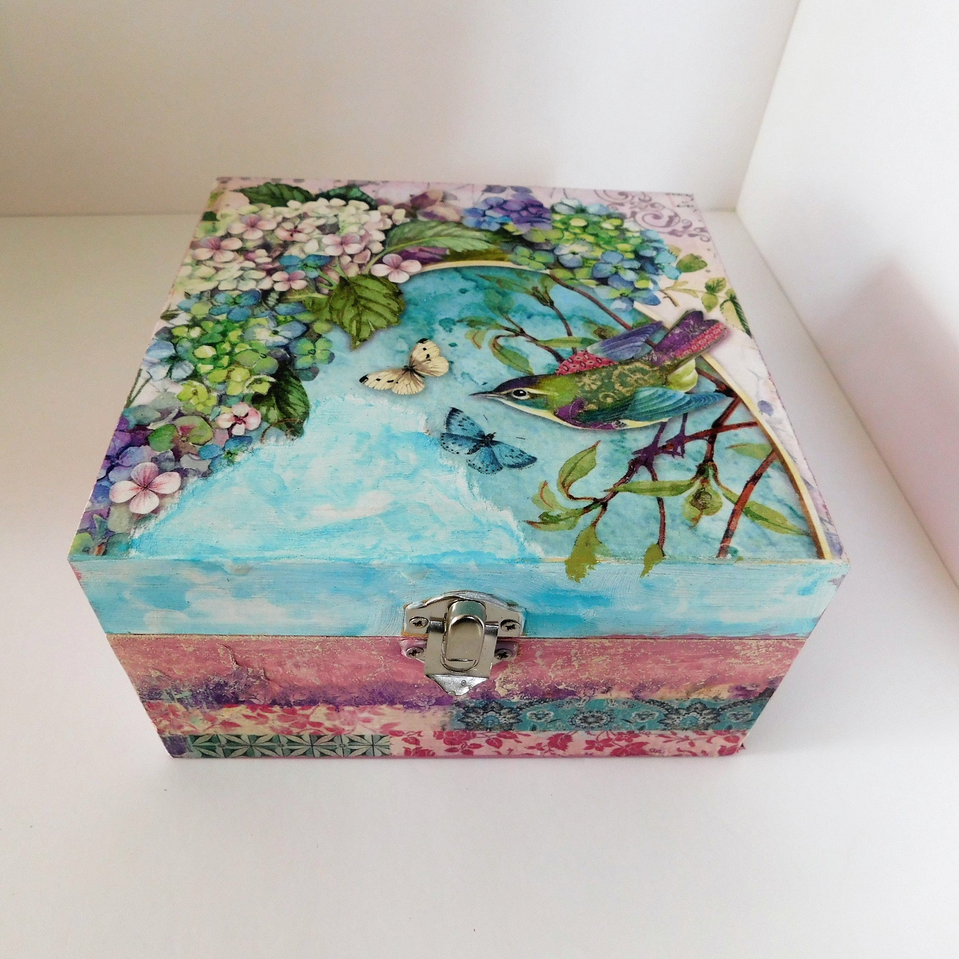 Wooden box painted with acrylic paints, and decorated with the decoupage technique using Stamperia's high quality rice paper and acrylic paints. Lightly varnished for protection