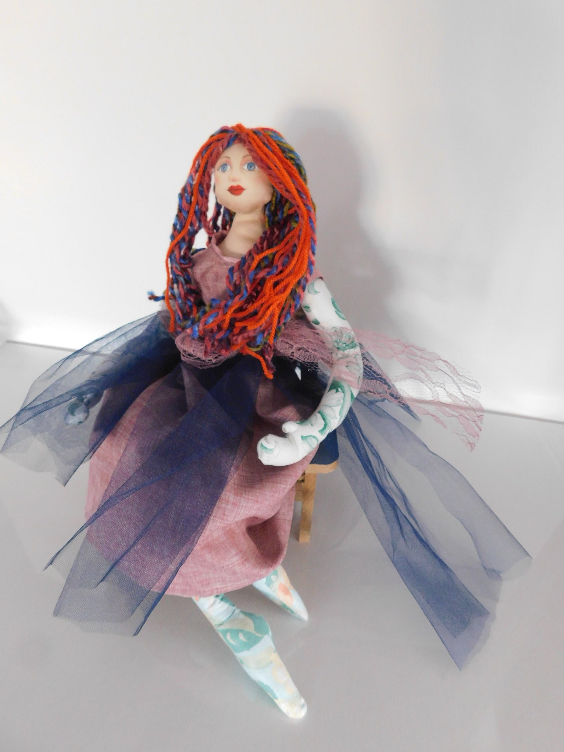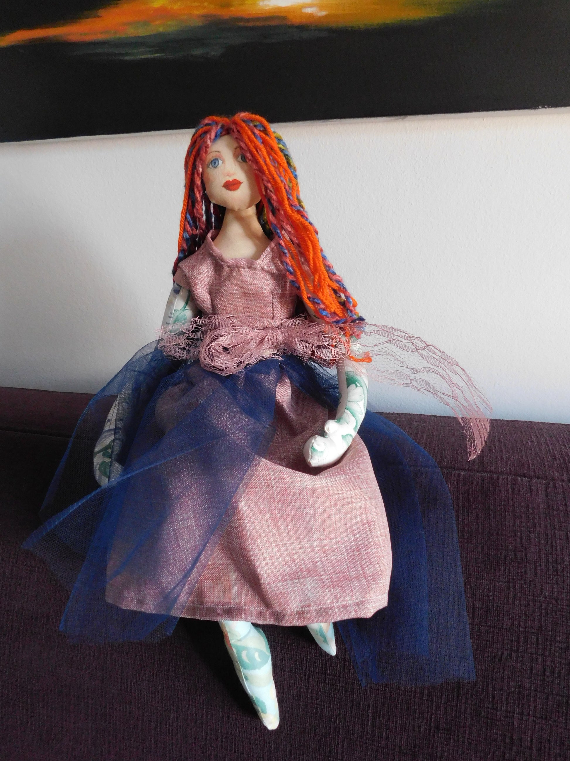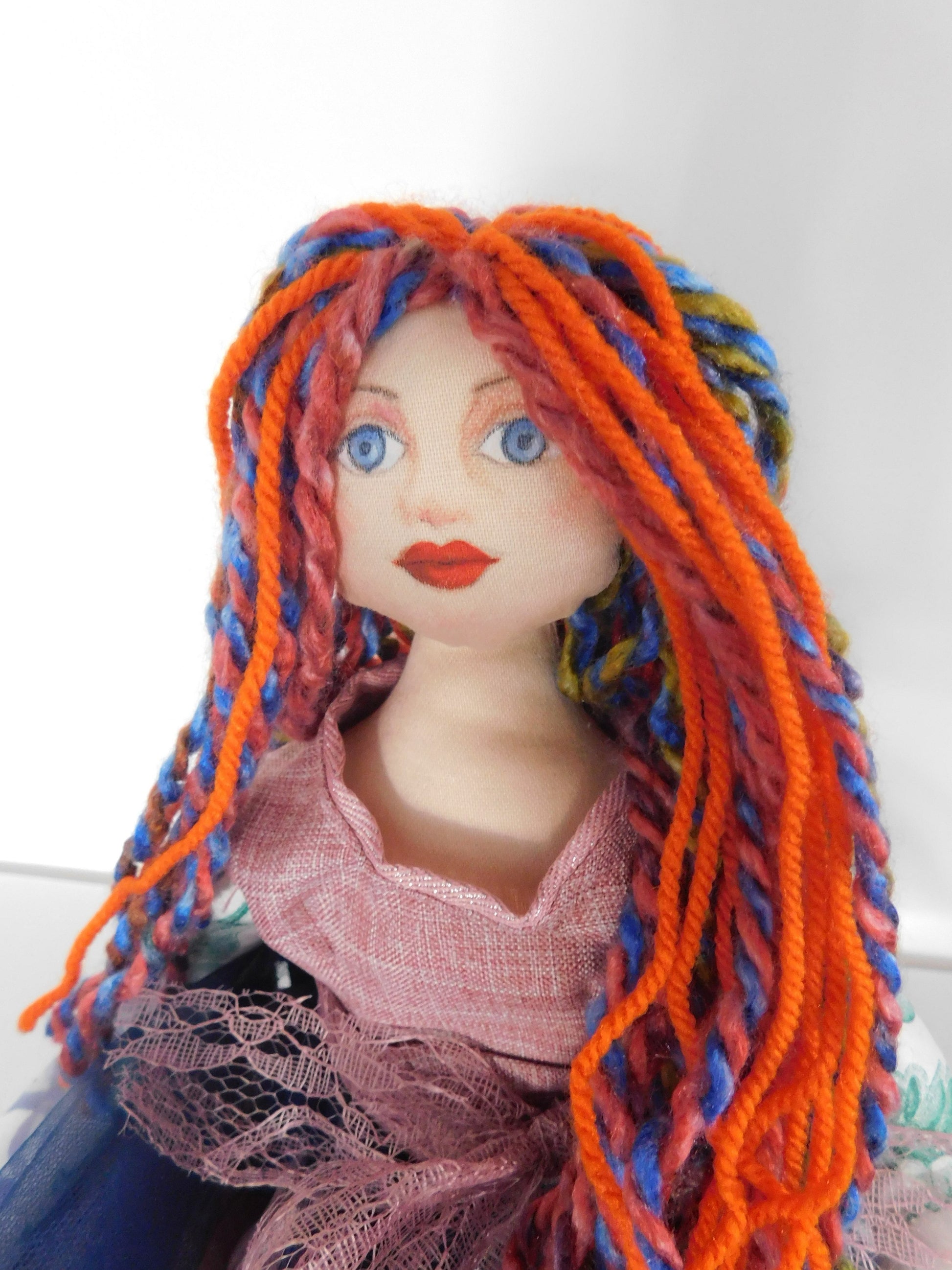 Made from various pieces of left over fabrics Candy has multi-colour hair made of wool and a nice dress decorated with pale pink ribbon. Her body is filled with Polyester Craft Filling (manufactured in UK) which is washable, however it is advisable to be cleaned with care since the face of the doll is hand painted.