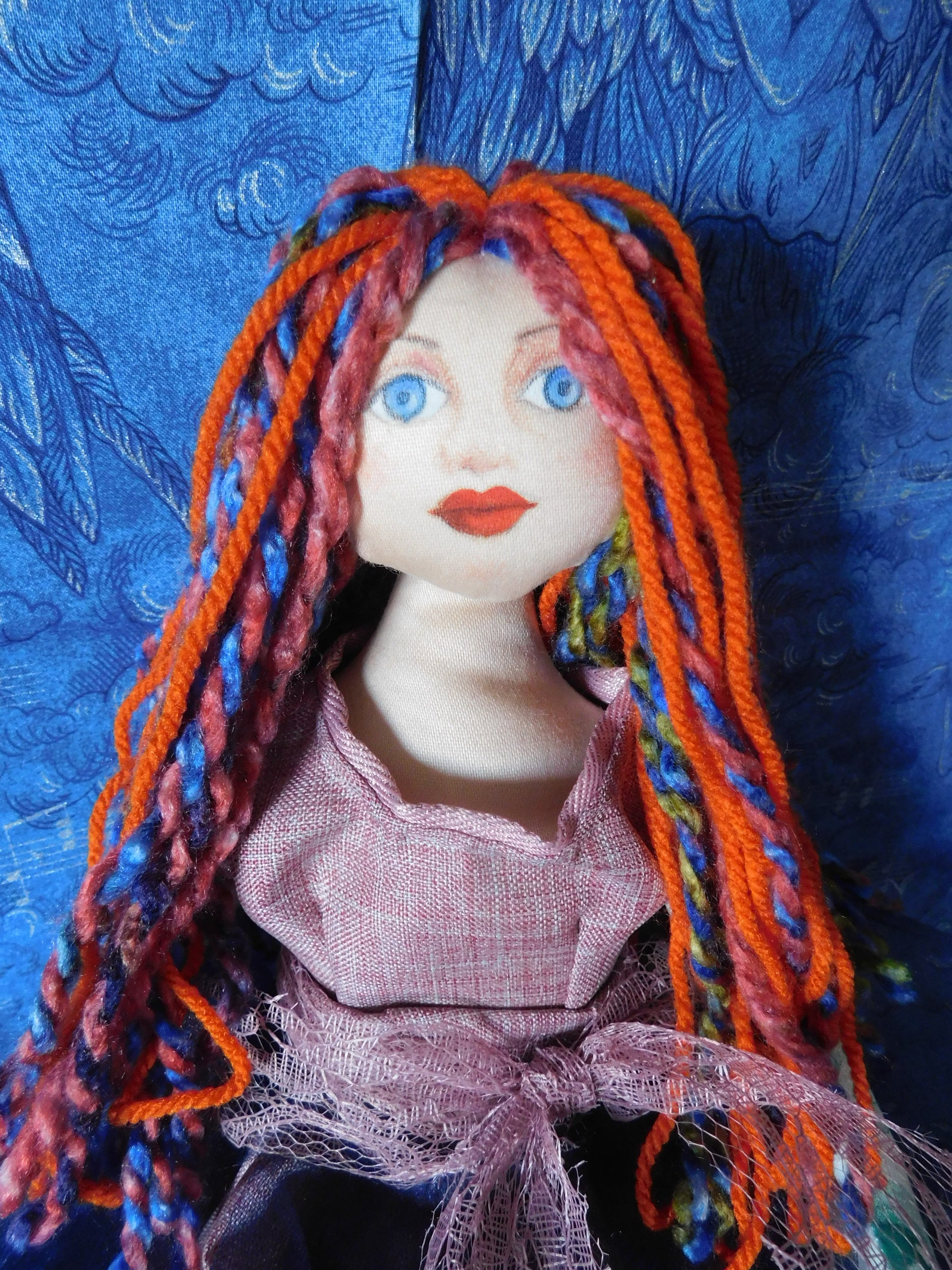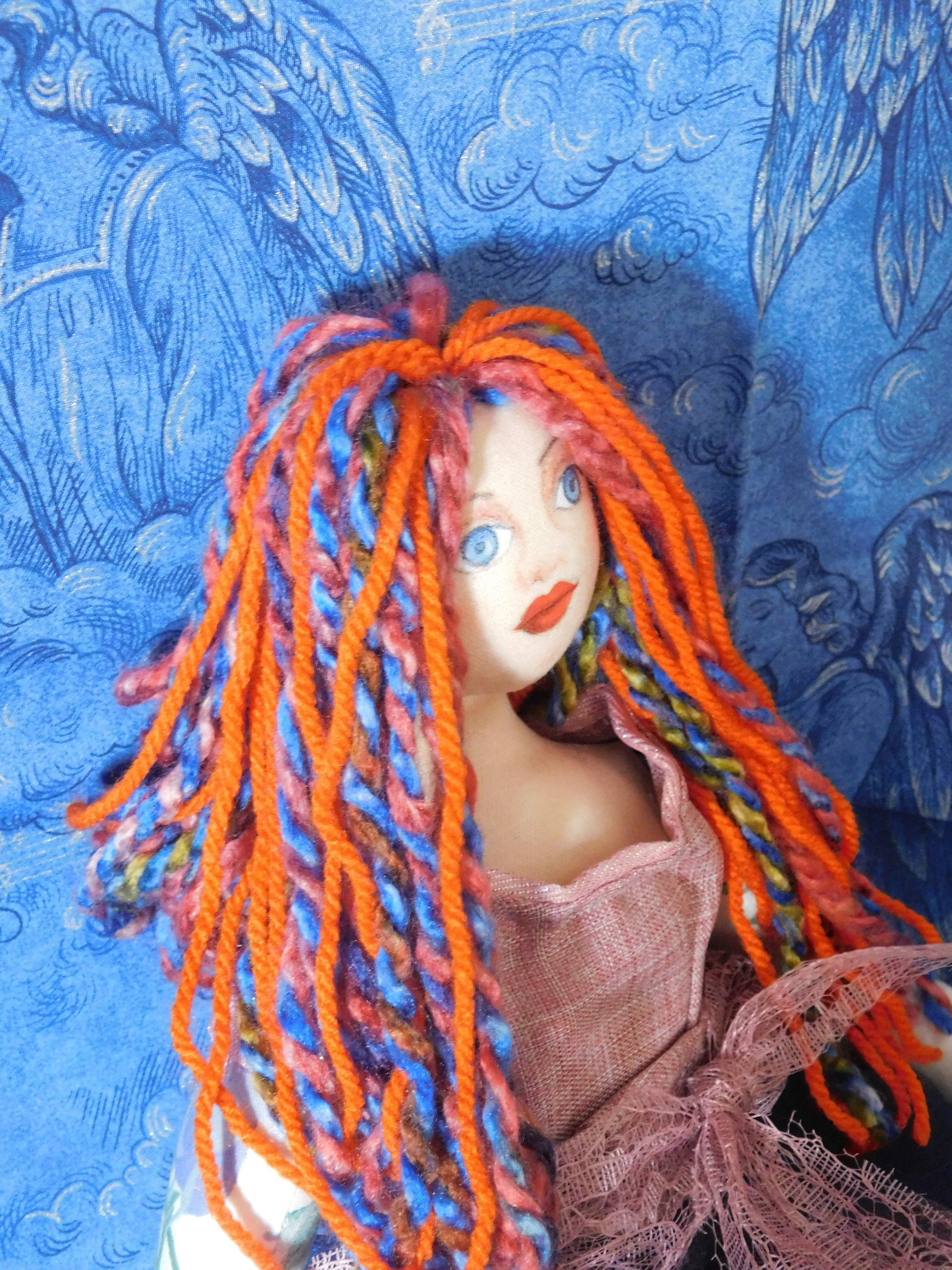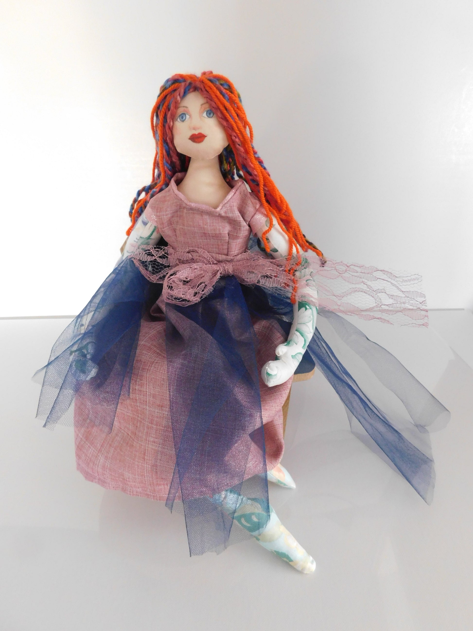 Made from various pieces of left over fabrics Candy has multi-colour hair made of wool and a nice dress decorated with pale pink ribbon. Her body is filled with Polyester Craft Filling (manufactured in UK) which is washable, however it is advisable to be cleaned with care since the face of the doll is hand painted.