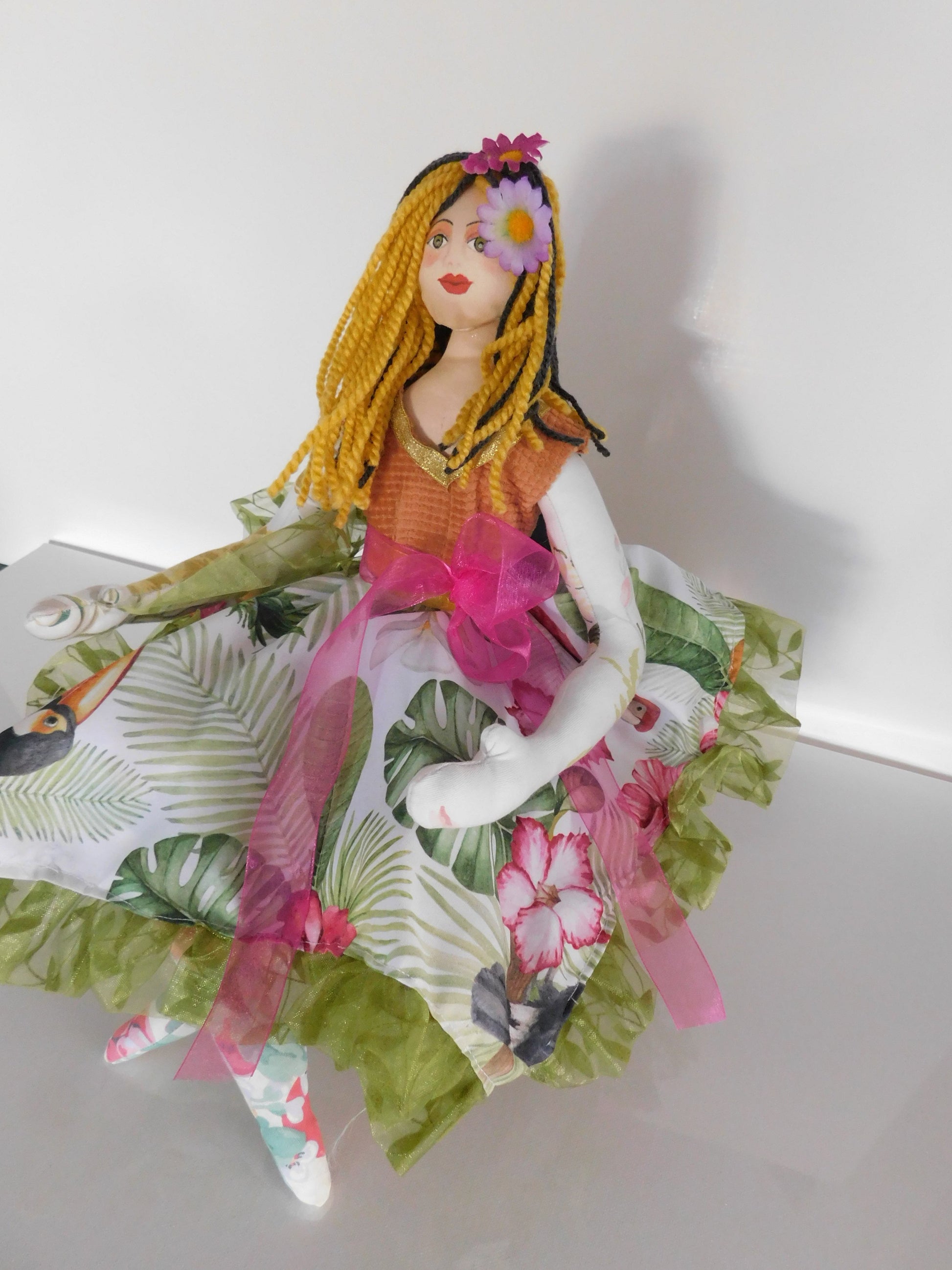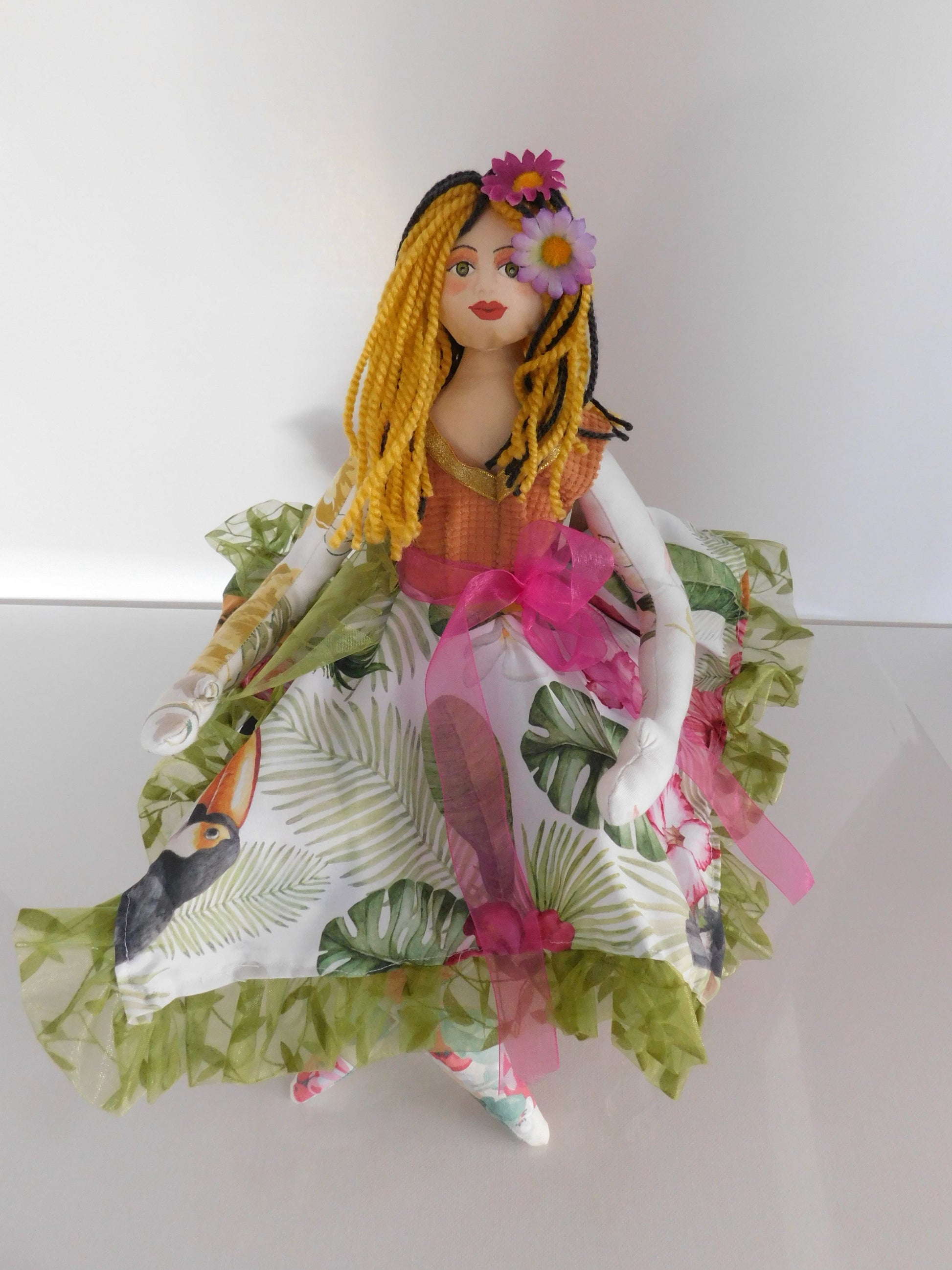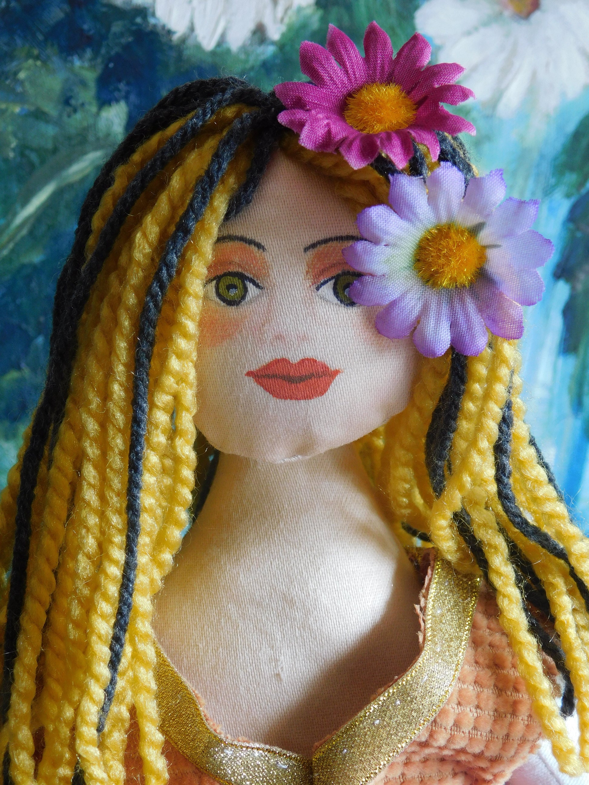 Daisie! Made of various pieces of left over fabrics. She has yellow/grey hair made of wool. Her body is filled with Polyester Craft Filling (manufactured in UK) which is washable, however it is advisable to be cleaned with care since the face of the doll is hand painted.