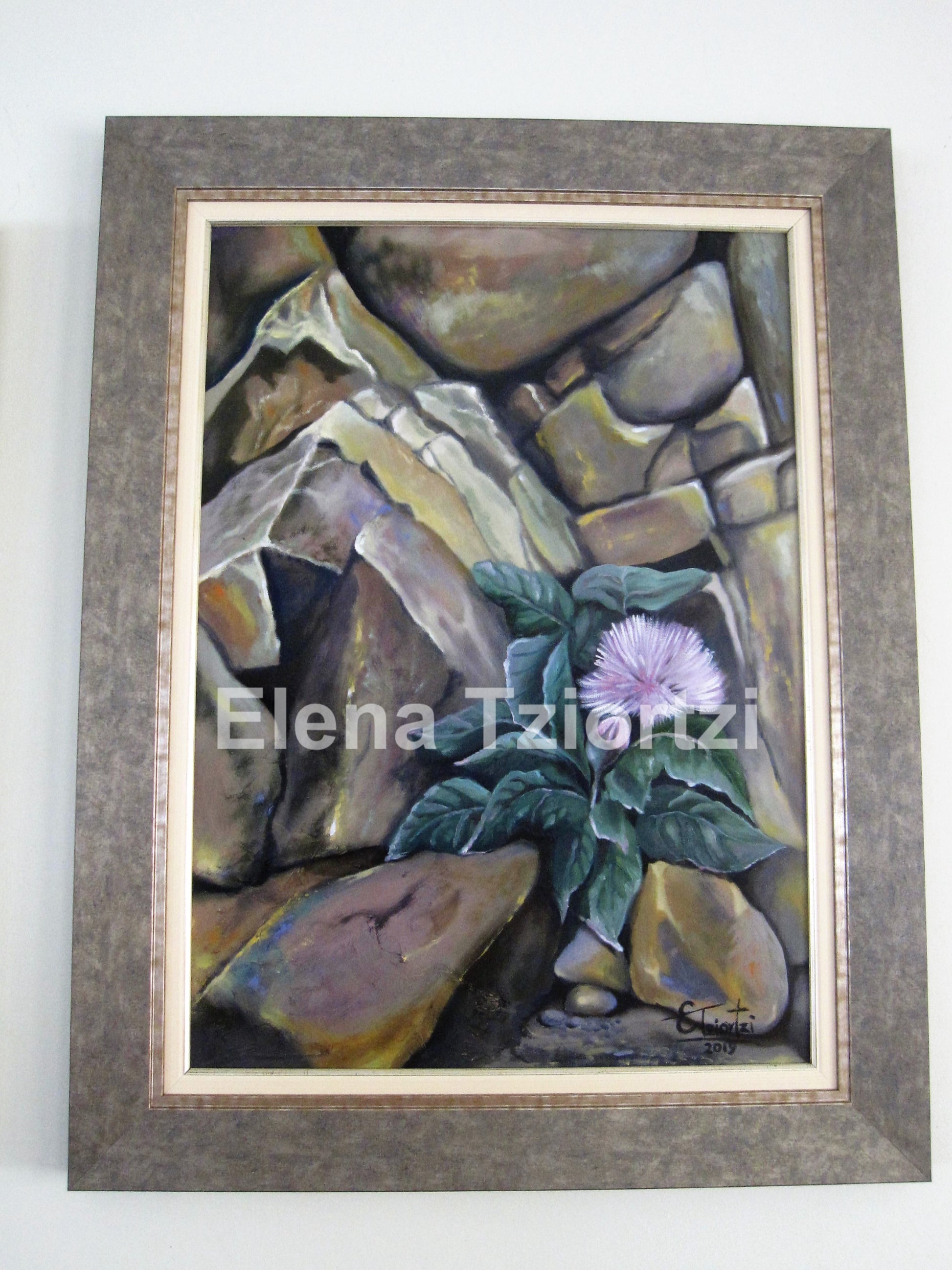 An original oil painting by artist Elena Tziortzi featuring a pink cactus on a rock. The painting features this beautiful little cactus found at Pomos area. The canvas is framed with a silver wide frame with a matching off-white thin second frame.