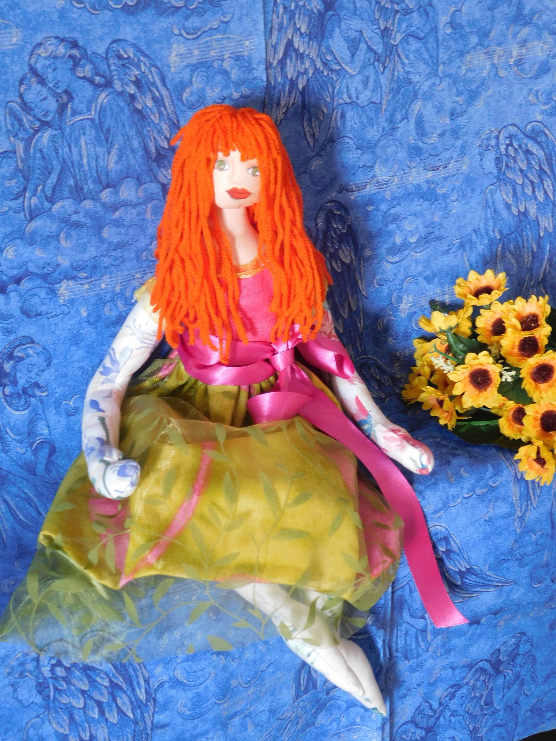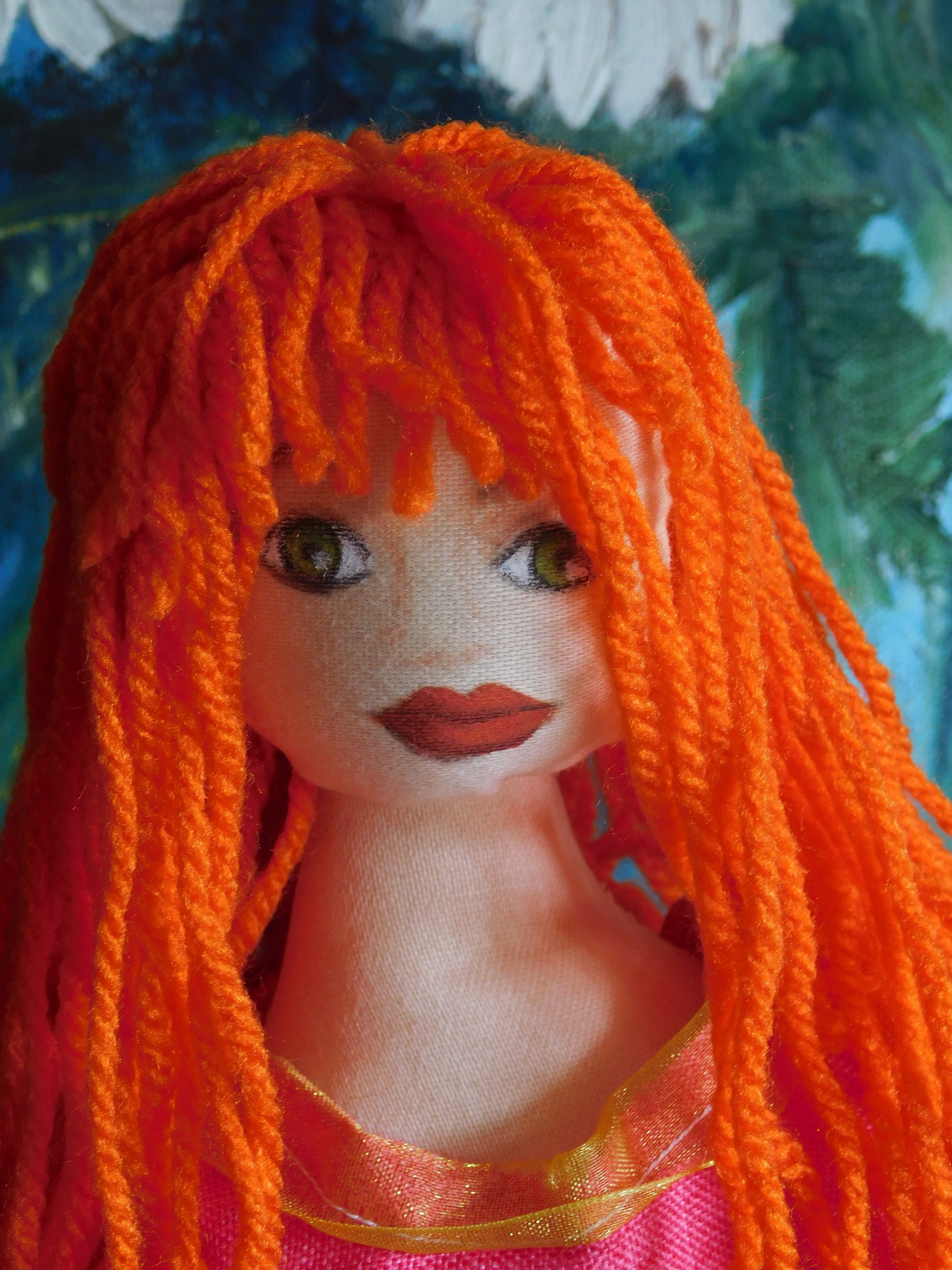 Made of various pieces of left over fabrics this doll has bright orange long hair made of wool and a pink top with a green skirt decorated with a pink ribbon. Her body is filled with Polyester Craft Filling (manufactured in UK) which is washable, however it is advisable to be cleaned with care since the face of the doll is hand painted.