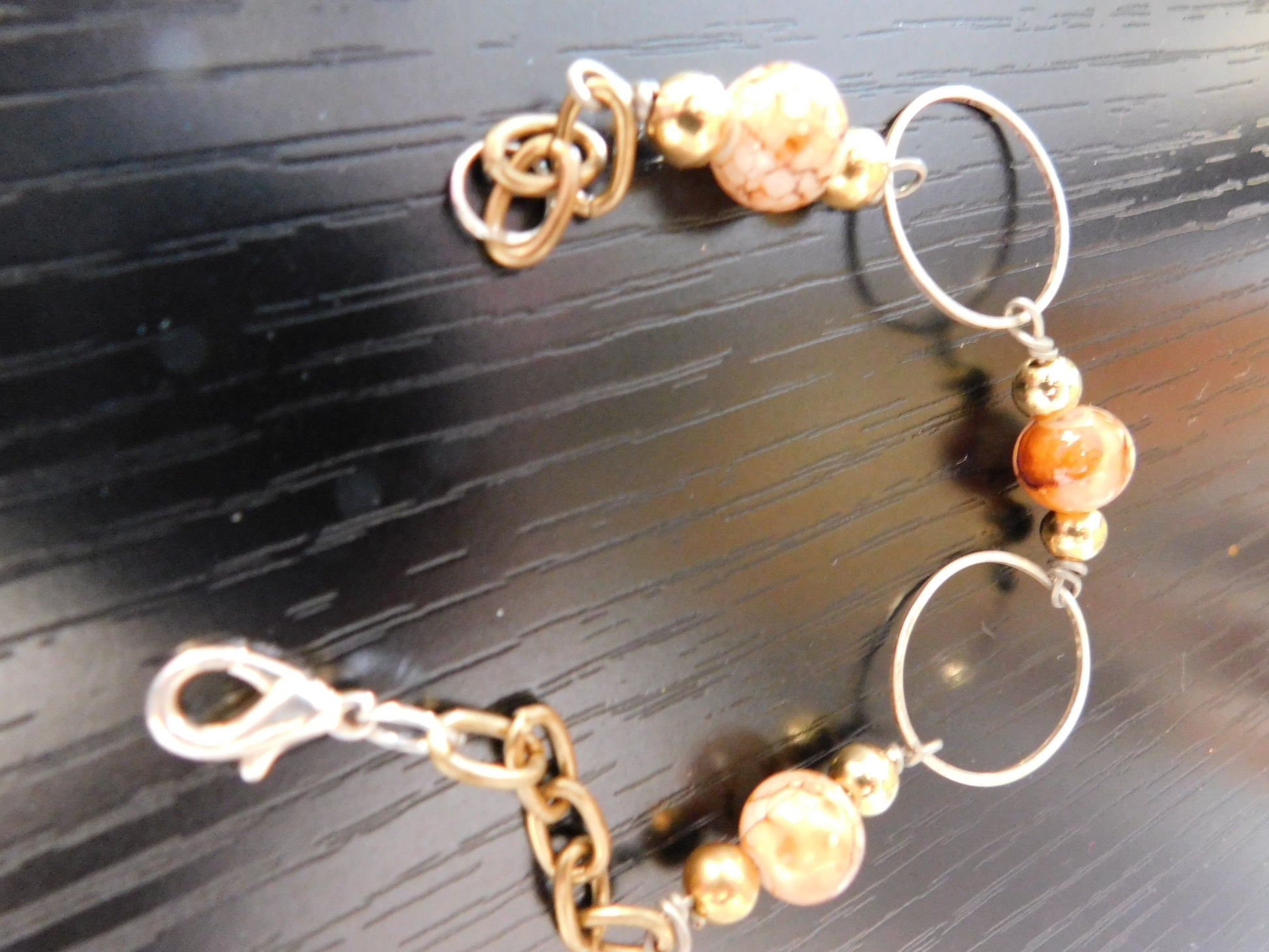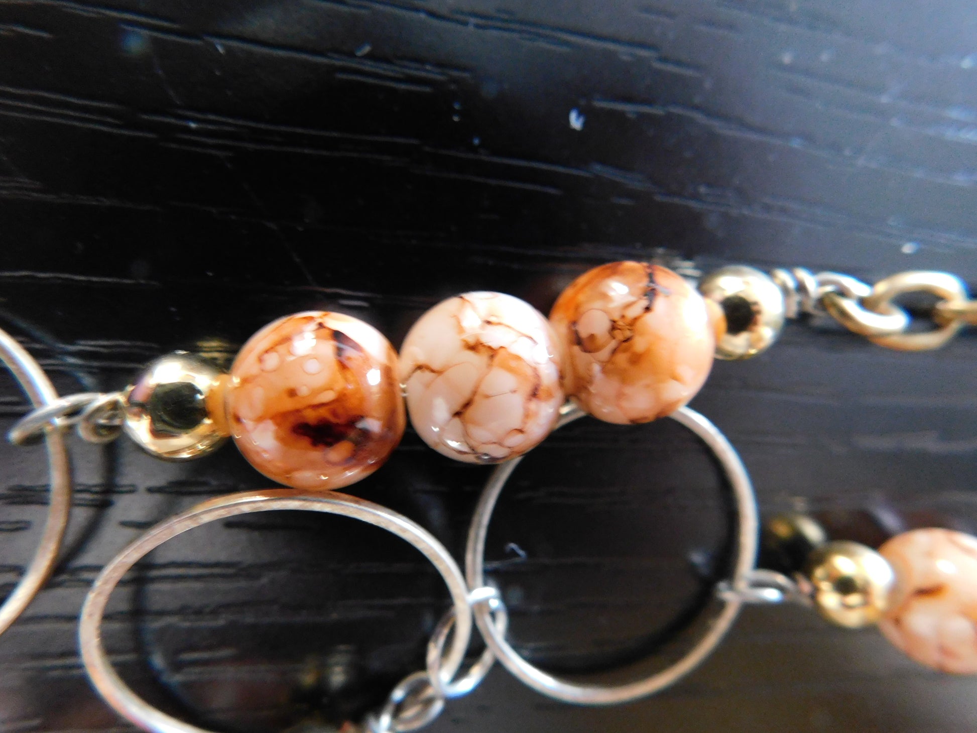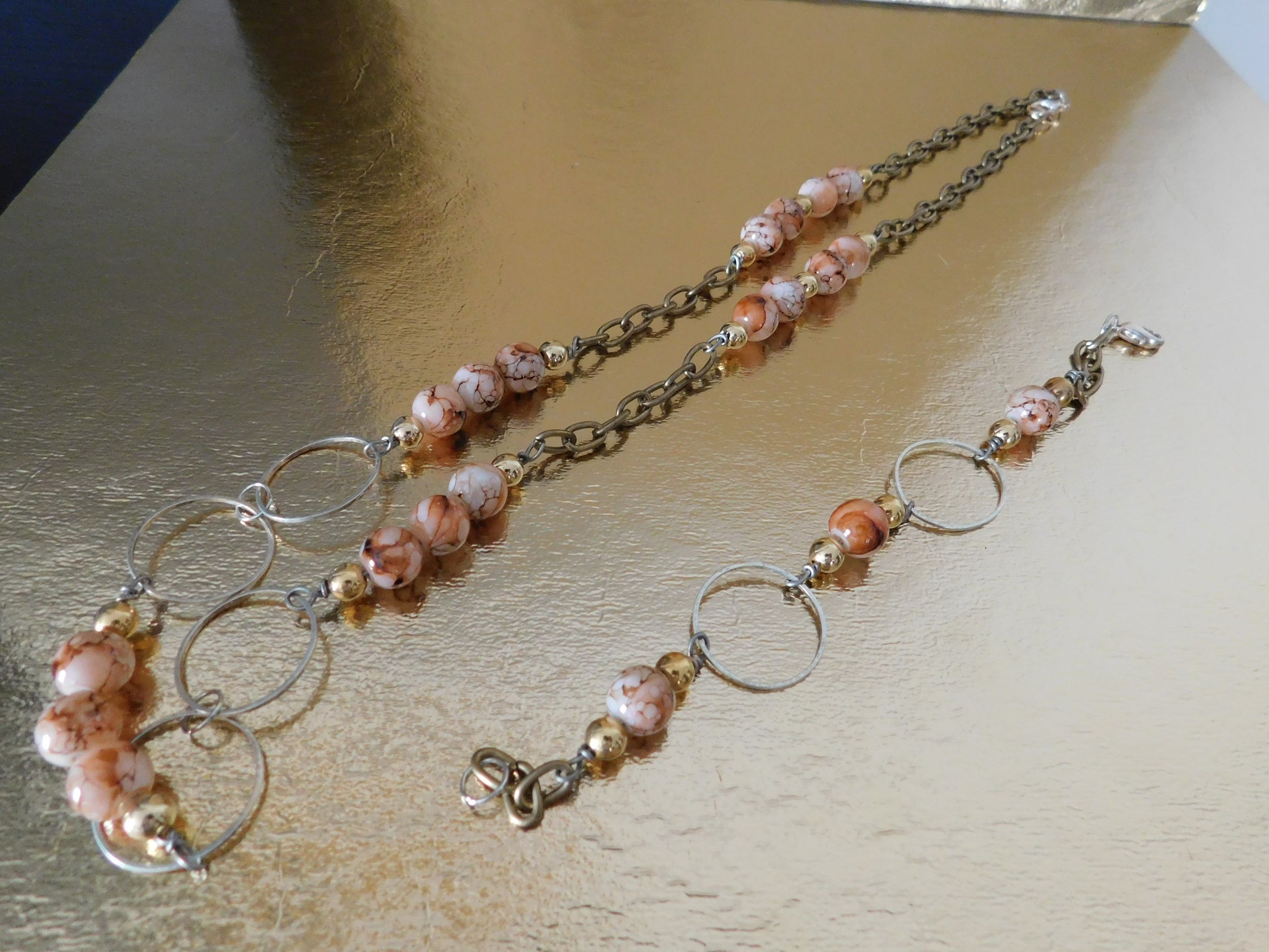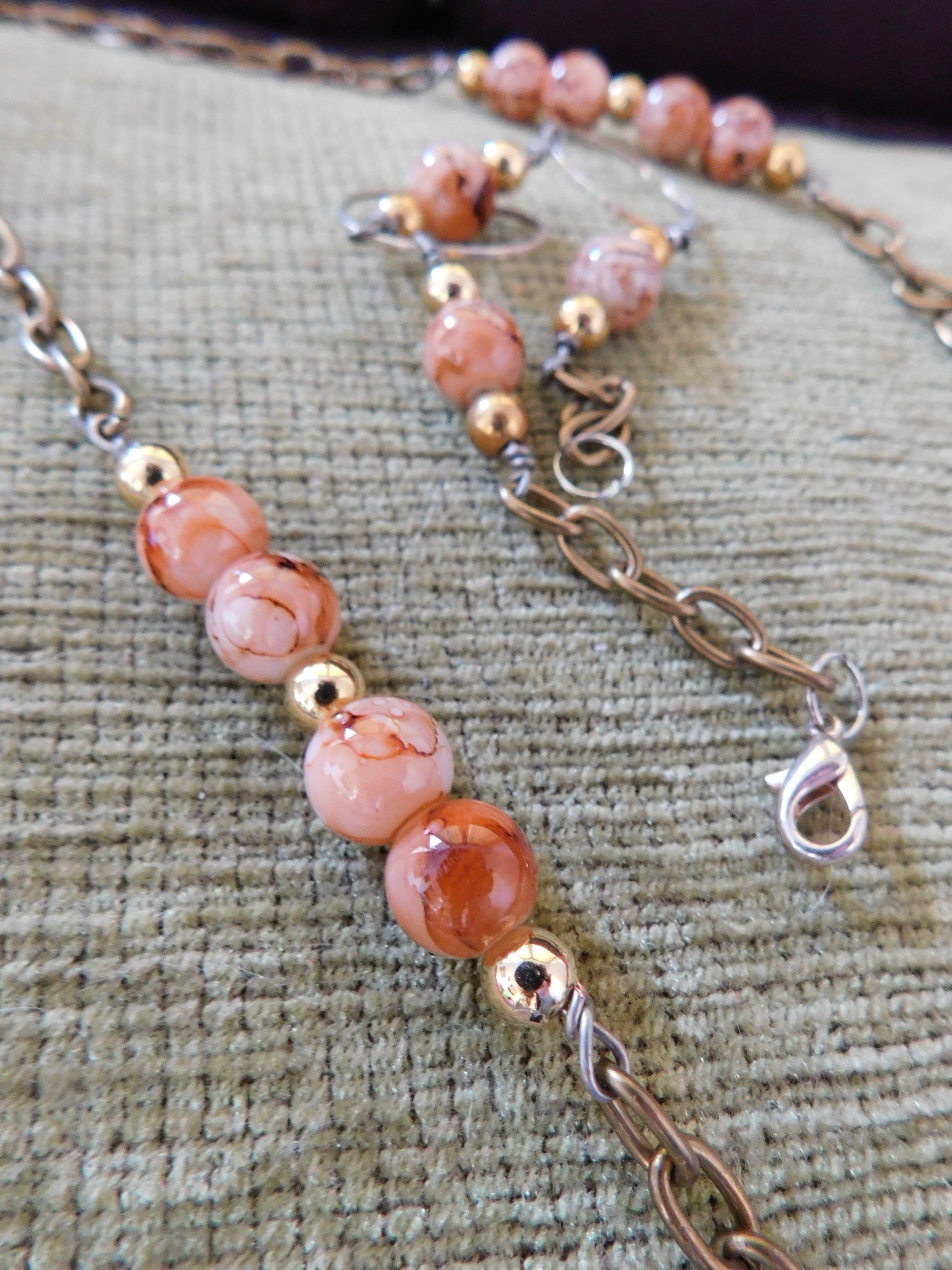 You will love this set of apricot orange/pink marble textured beads pendant and bracelet. Silver thin hooks, golden chain, small round beads. A classic yet modern set for you to look radiant.