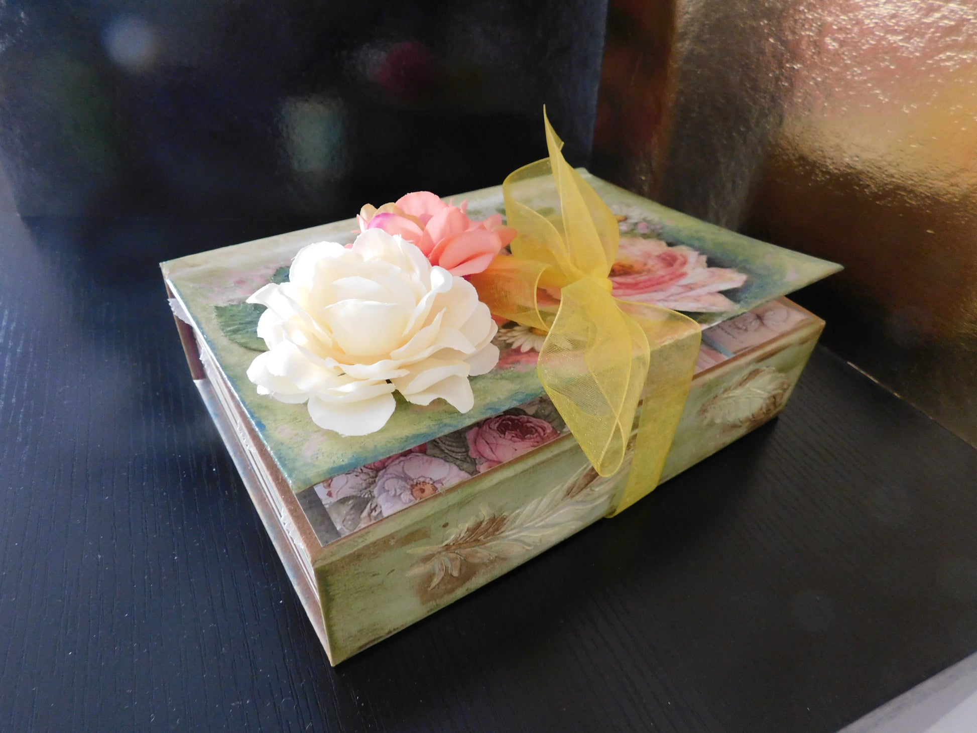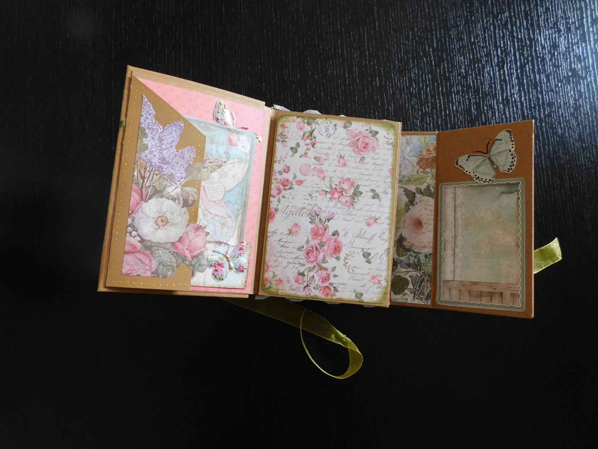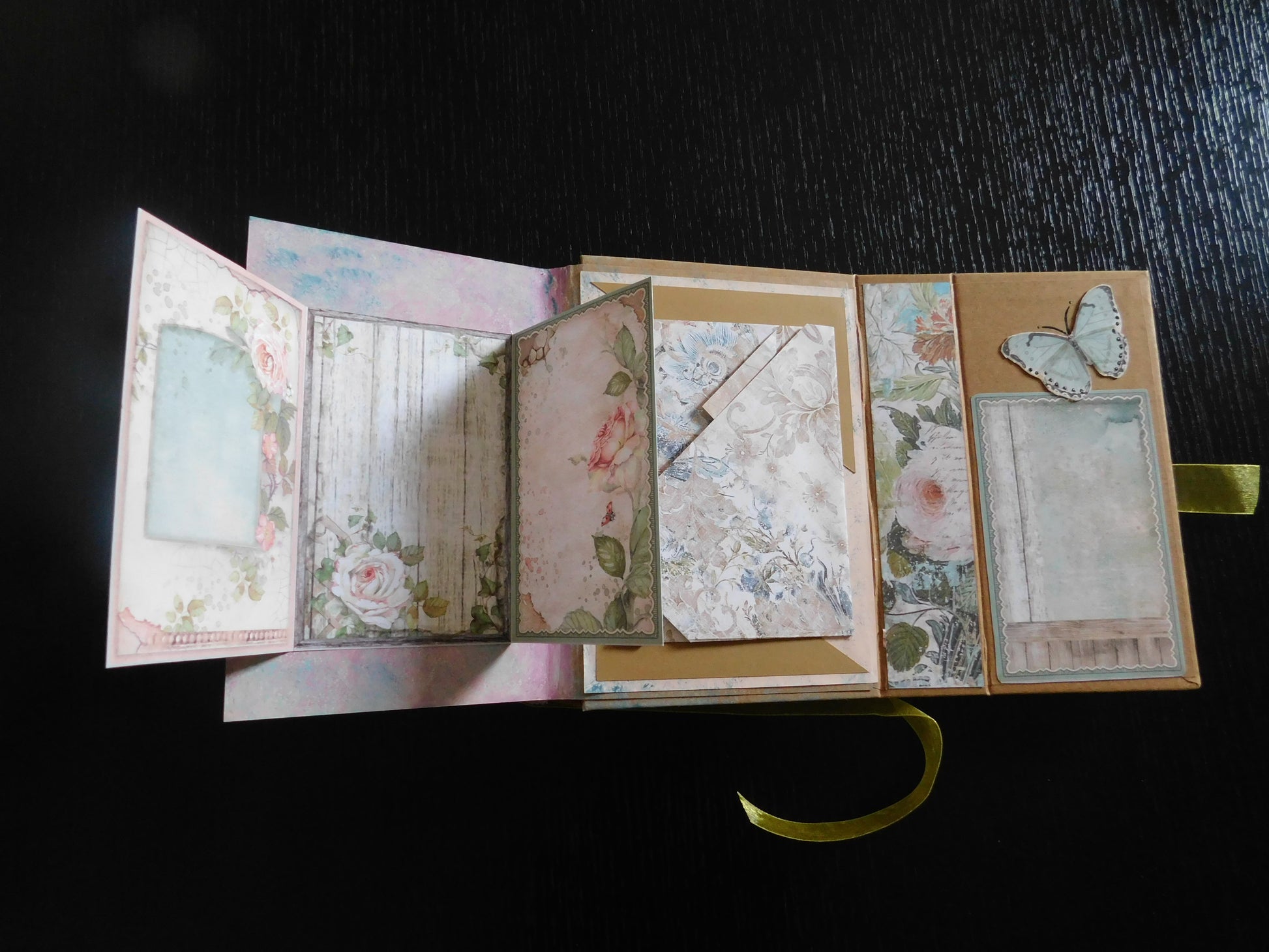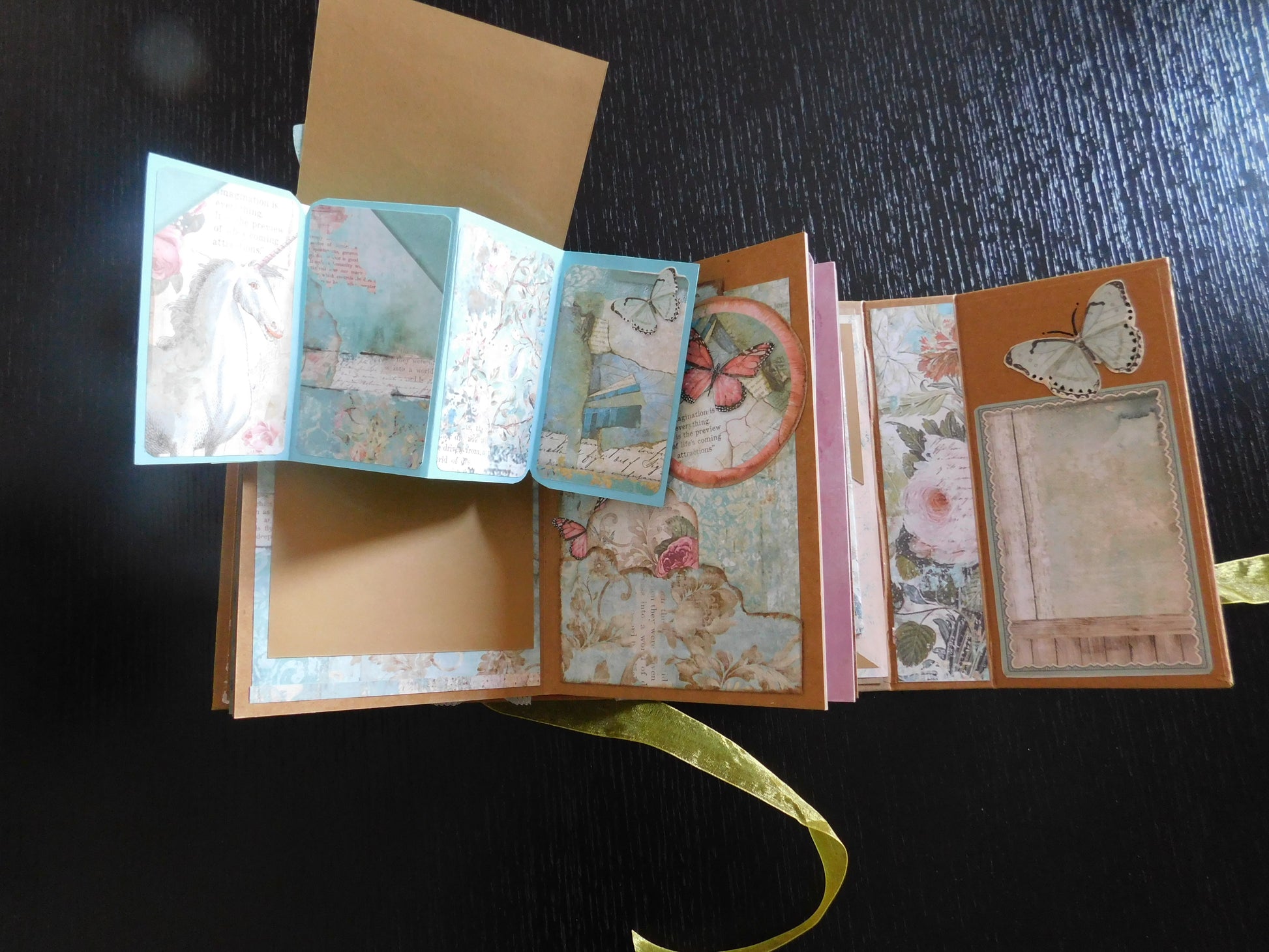 A handmade photo album made with love, a variety of materials, and filled with lots and lots of pockets, and secret spaces for your photos. Small cards to write nice messages are included.