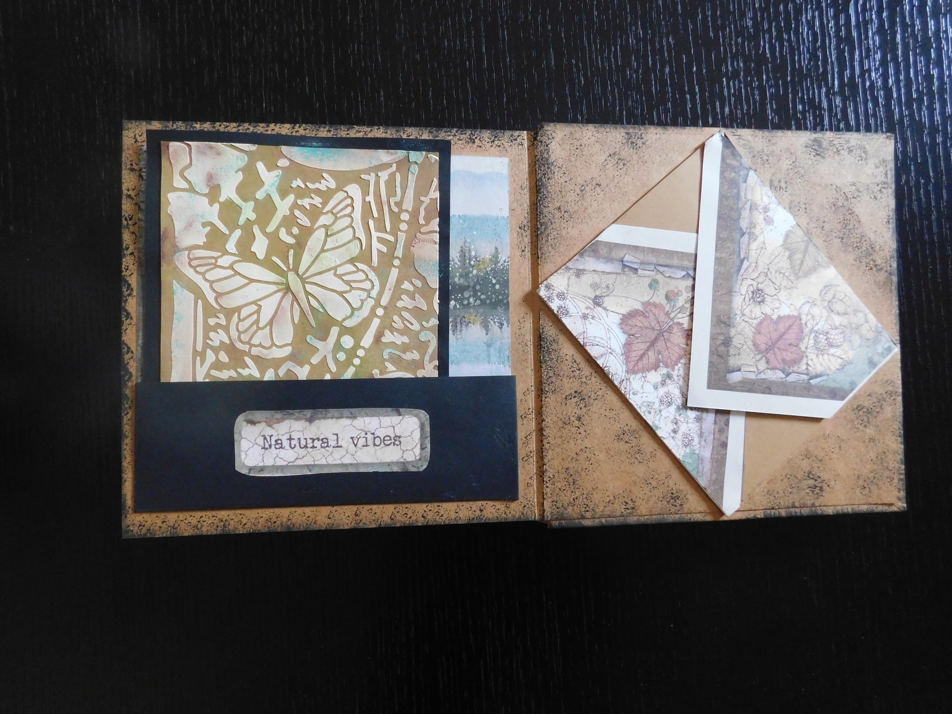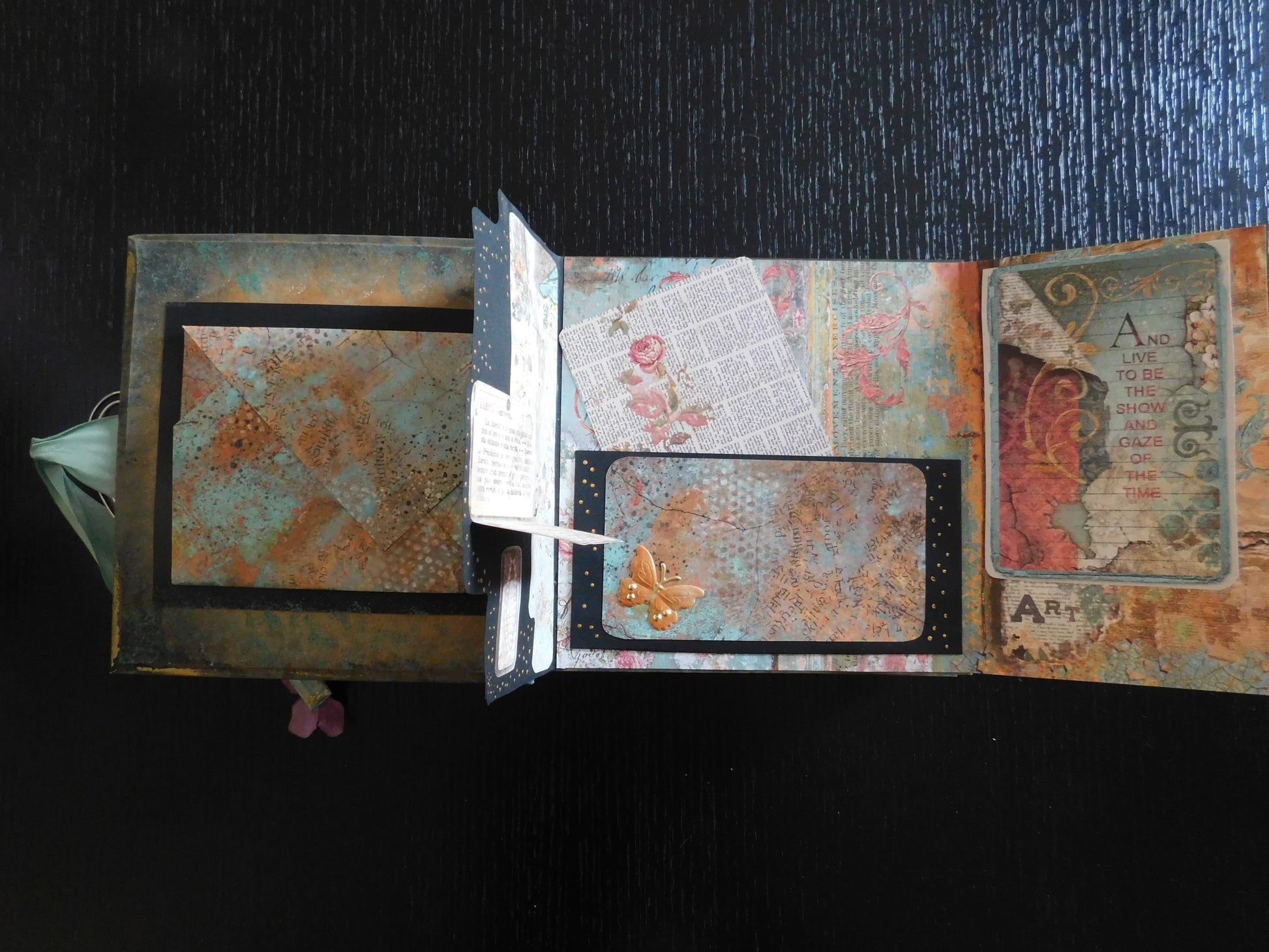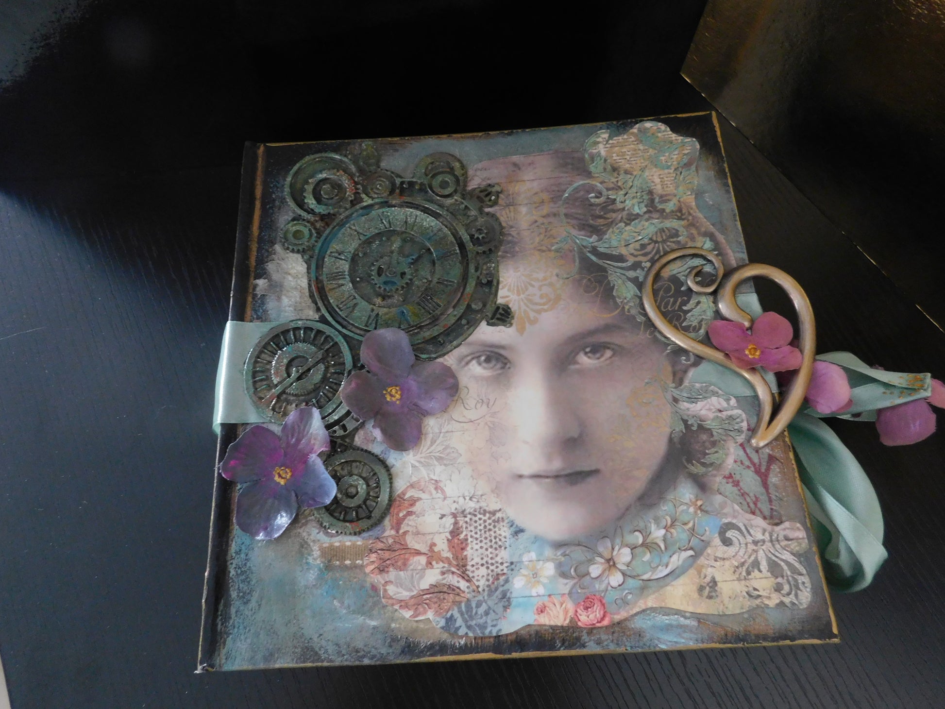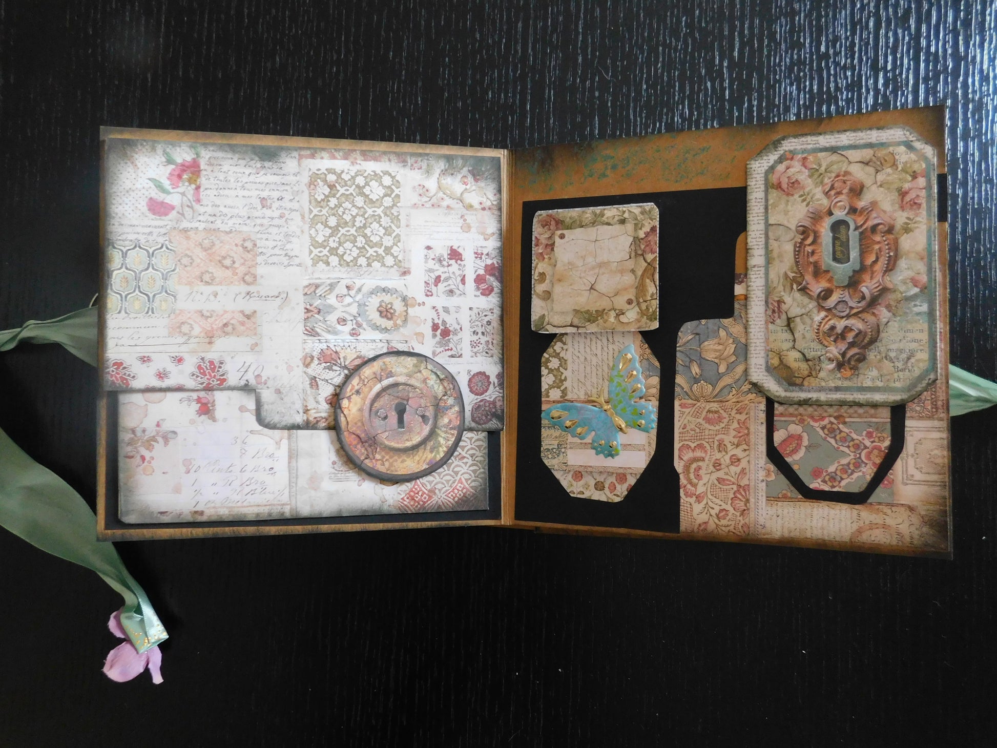 A handmade photo album , romantic and mysterious, made with love, a variety of materials, and filled with lots and lots of pockets, and secret spaces for your photos. Small cards to write nice messages are included.