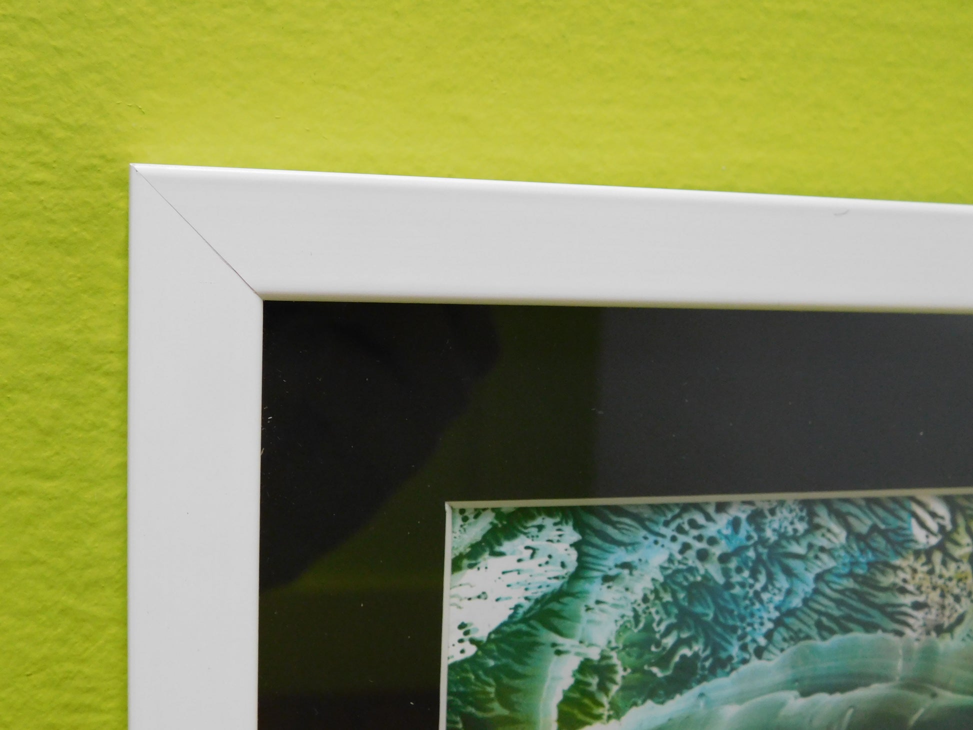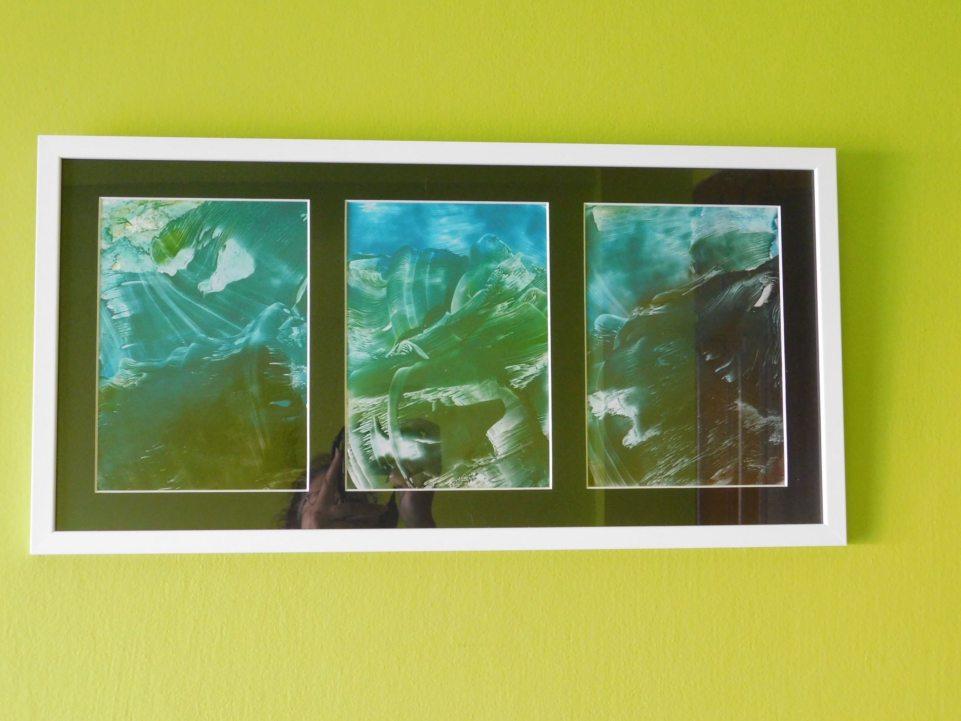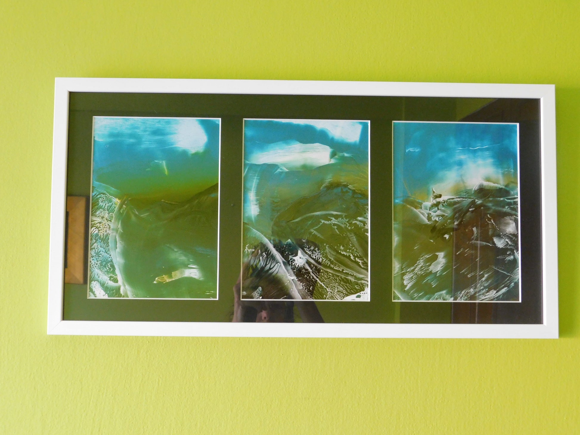 A lovely triptych of blue abstract encaustic wax seascape! The small paintings are done on photographic paper. The triptych is framed (white wooden frame) with clear glass for protection.