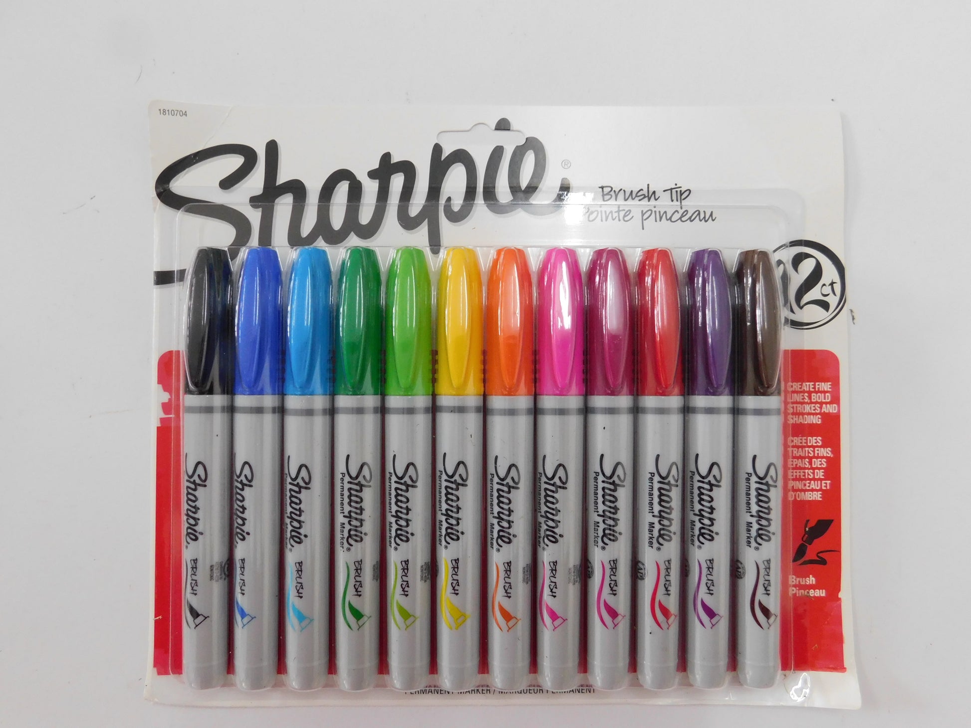 A set of 12 Sharpie brush tip permanent markers. Can be used on almost any surface. Use different pressure of your hand in order to achieve thick or thin lines.
