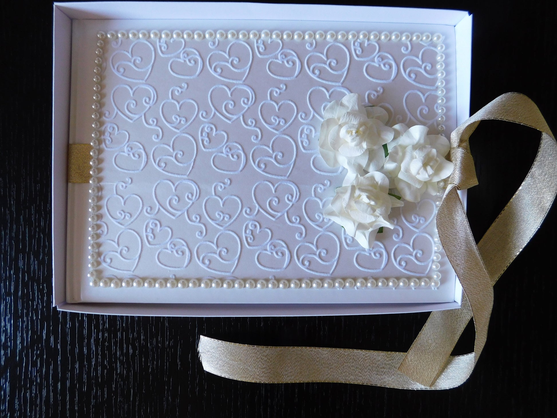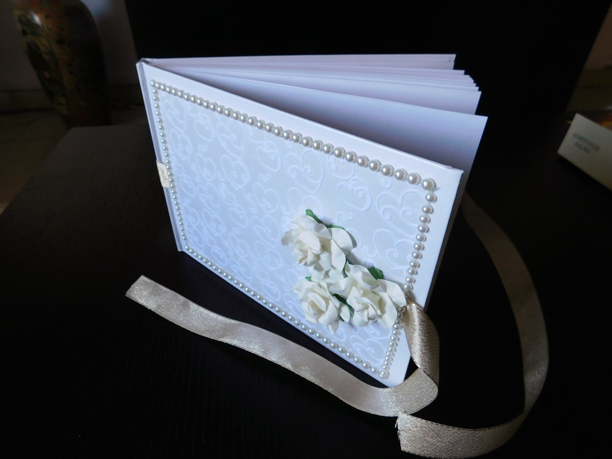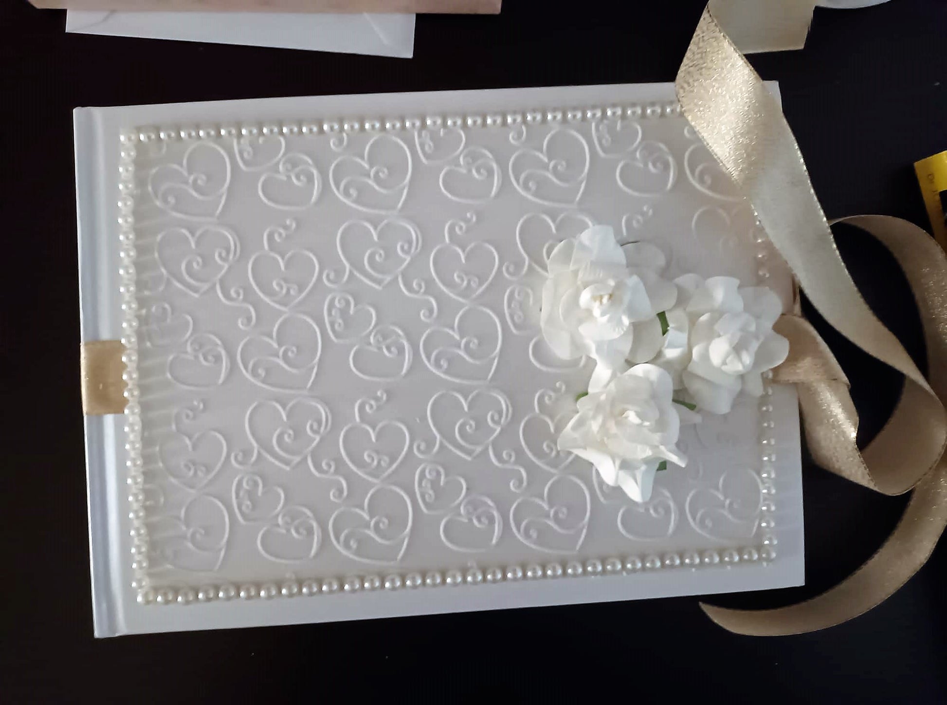 A small guest book for receiving your wedding wishes. Decorated with off white paper, pearls, roses and a soft golden ribbon. 76 pages of 150 gr. paper