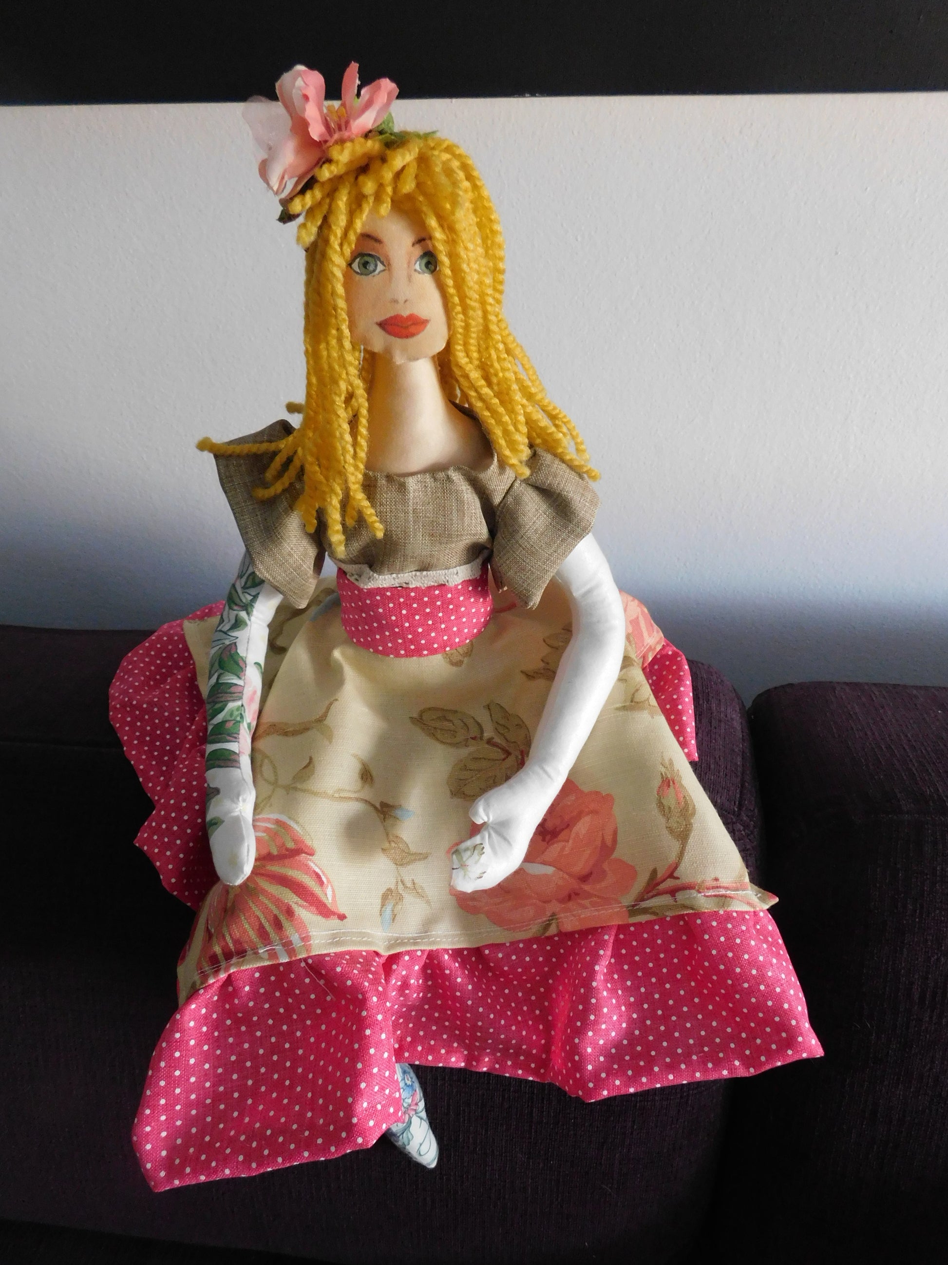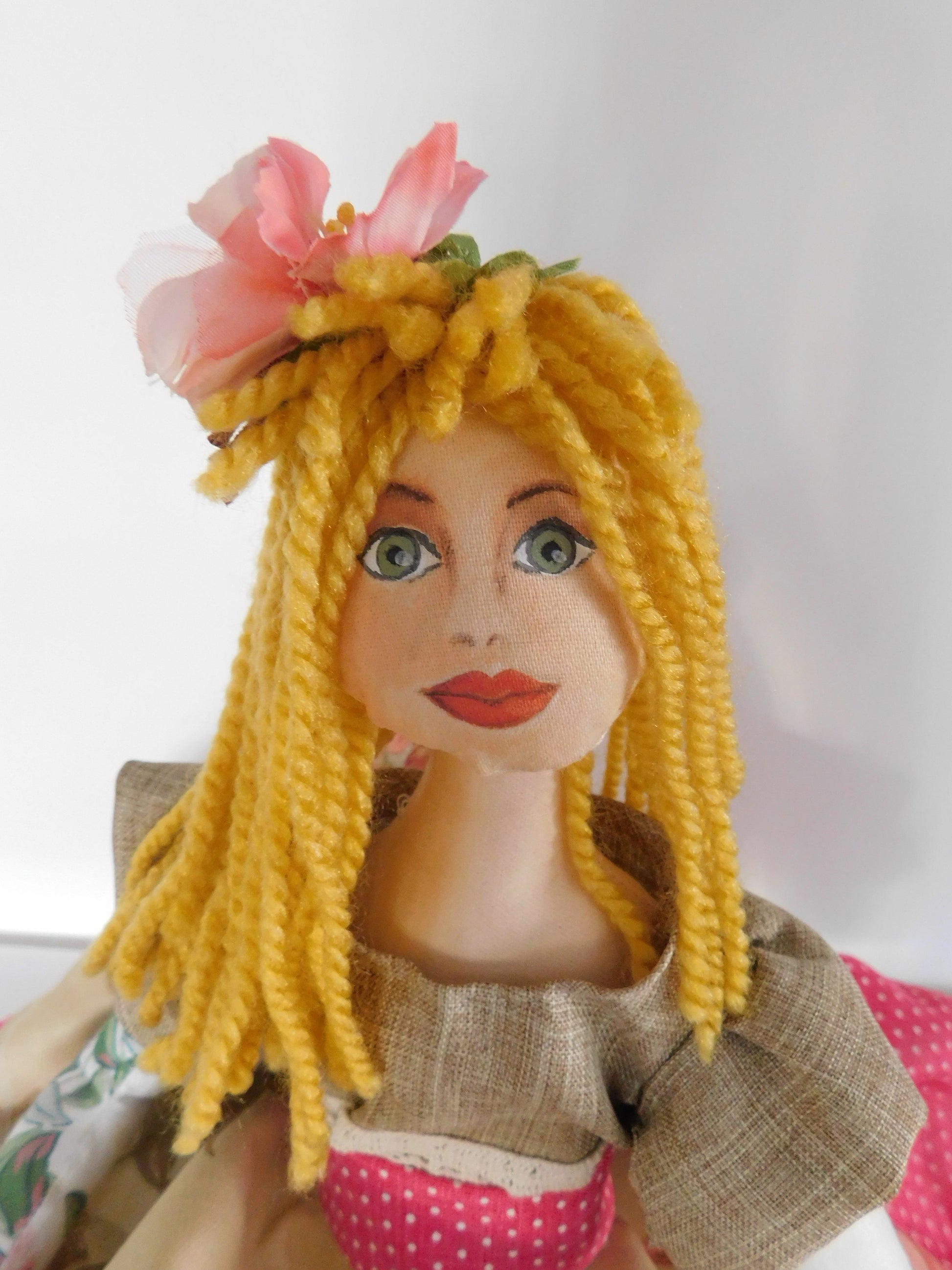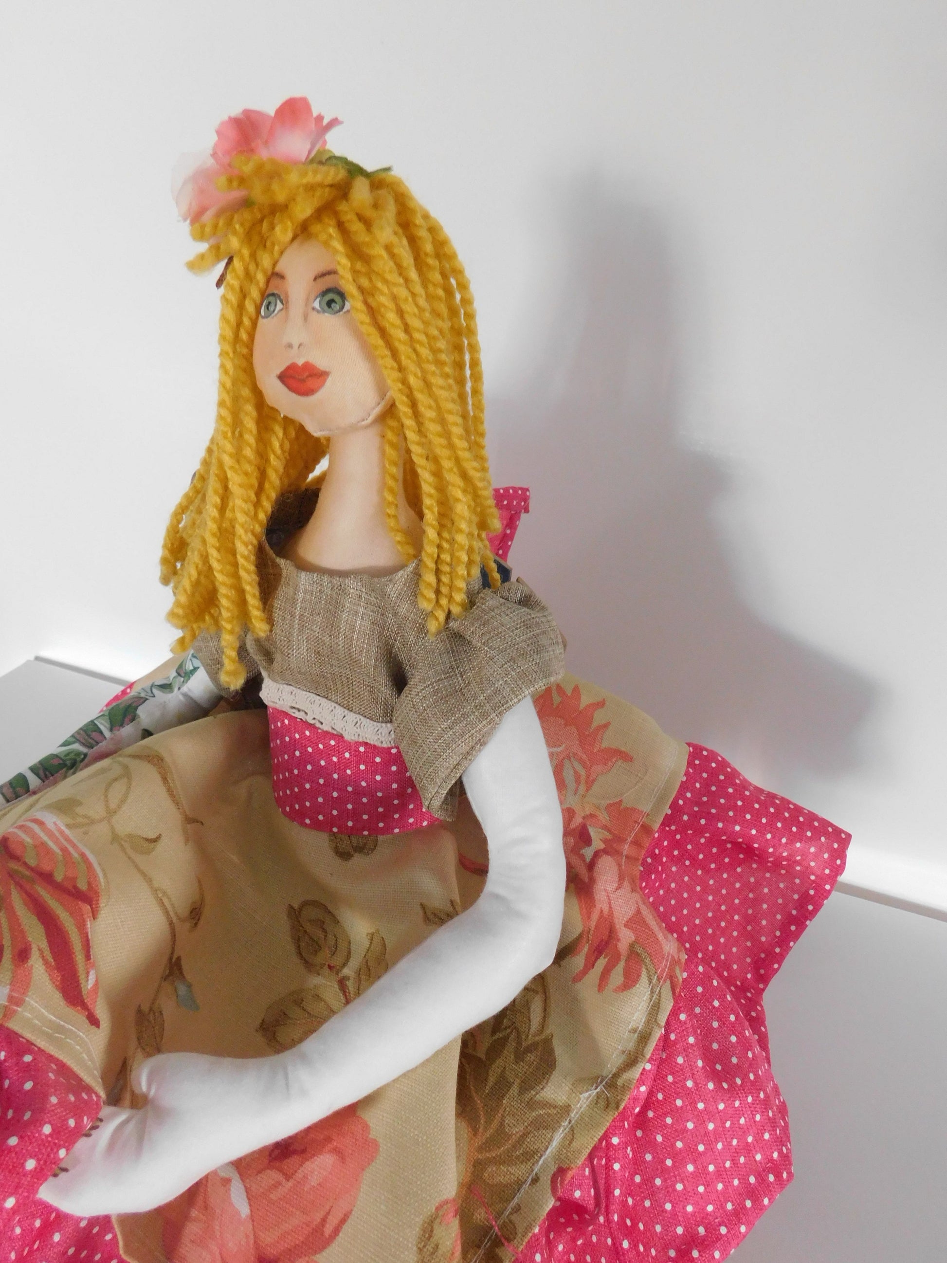 Made of various pieces of left over fabrics Spring has yellow long hair made of wool and a nice dress, light brown top with a pink floral skirt. Her body is filled with Polyester Craft Filling (manufactured in UK) which is washable, however it is advisable to be cleaned with care since the face of the doll is hand painted.