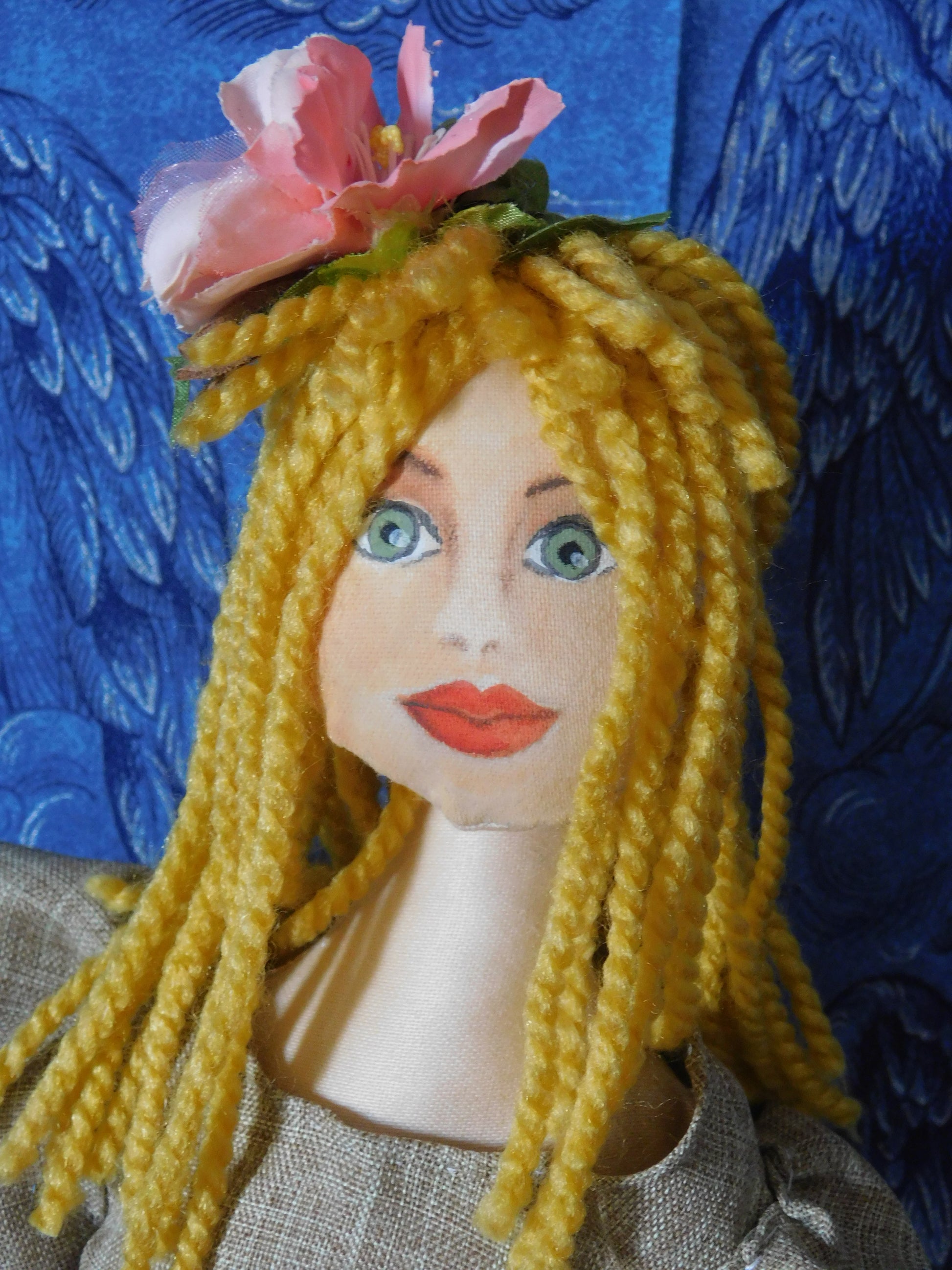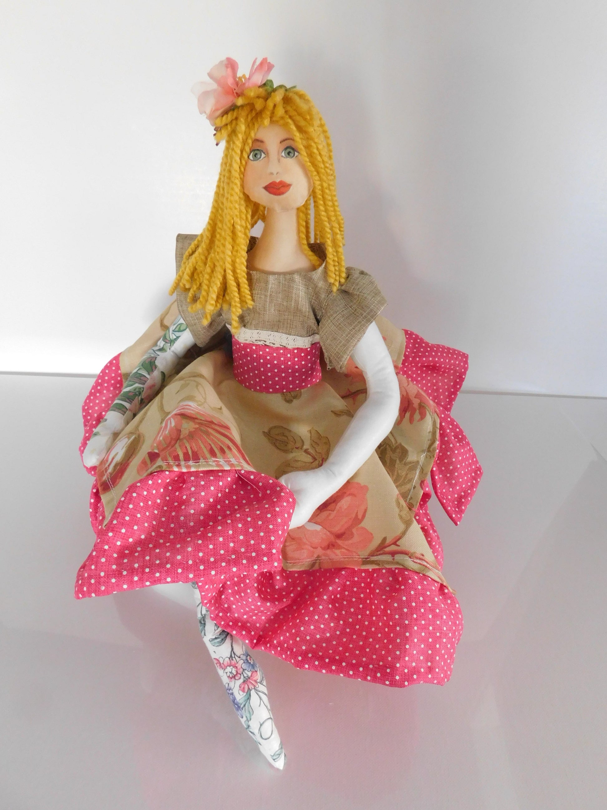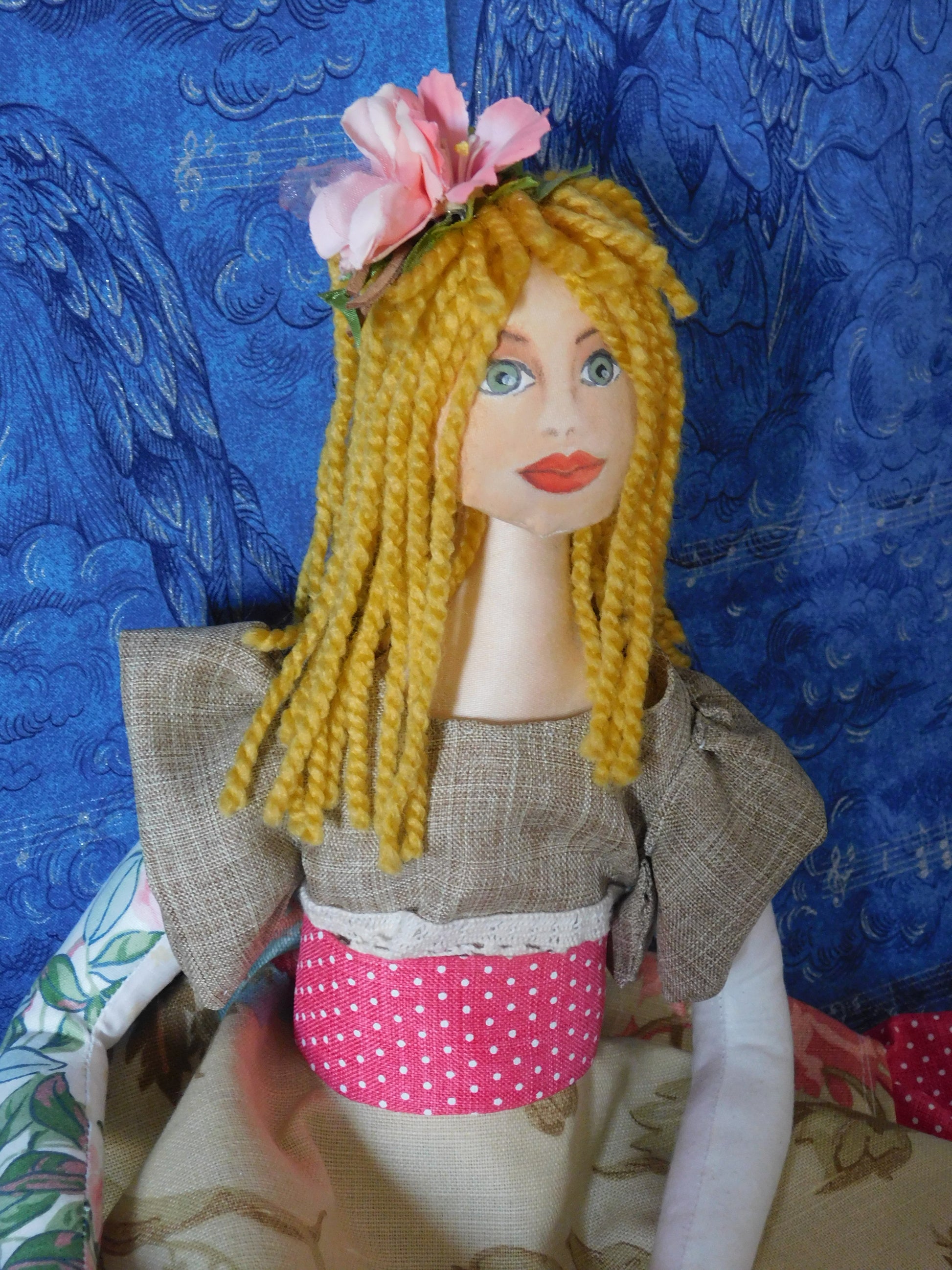 Made of various pieces of left over fabrics Spring has yellow long hair made of wool and a nice dress, light brown top with a pink floral skirt. Her body is filled with Polyester Craft Filling (manufactured in UK) which is washable, however it is advisable to be cleaned with care since the face of the doll is hand painted.