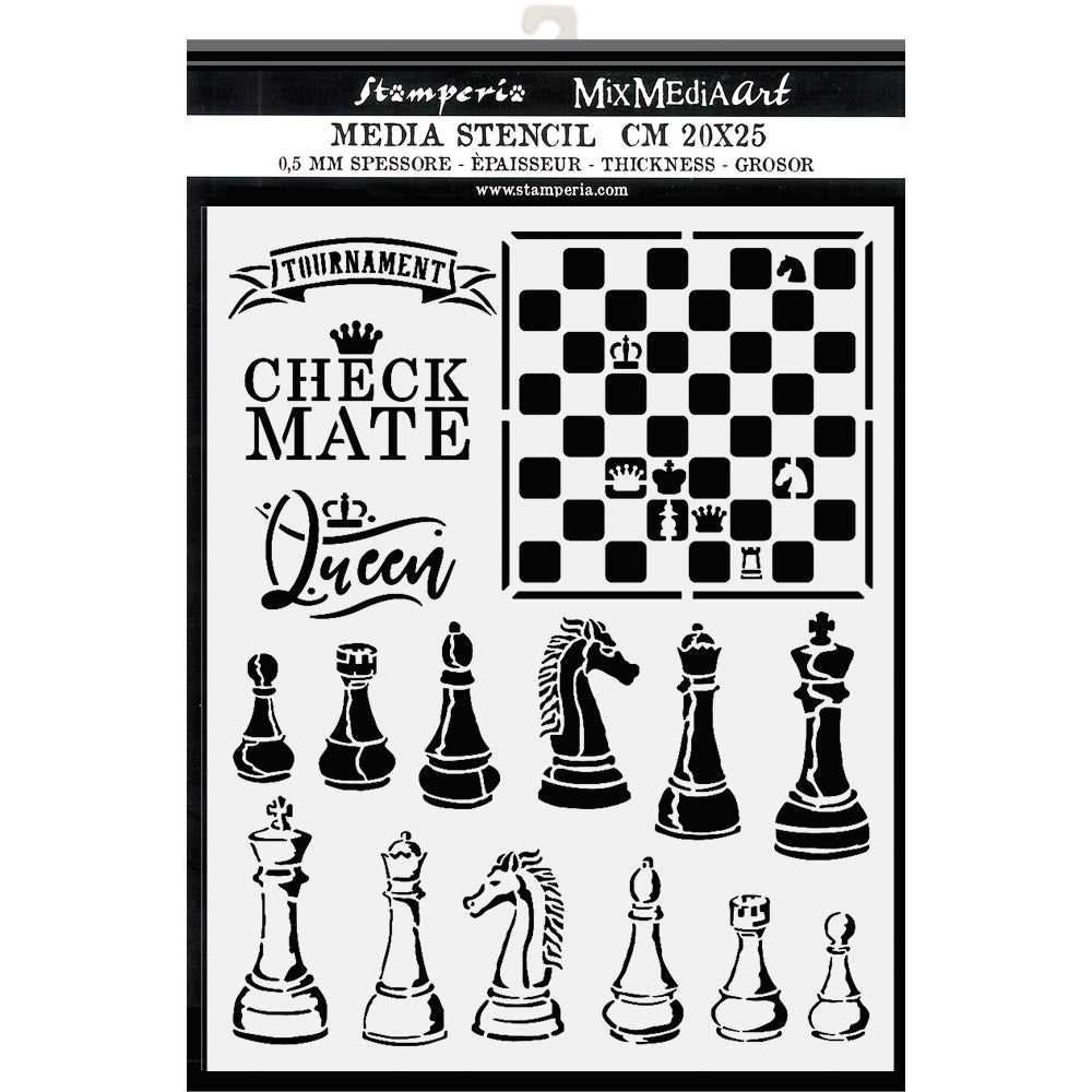 Stamperia 'Alice Check Mate" stencil with chess icons. Use it with cream paste for a 3D effect. Create beautiful chess images with acrylic paints and a sponge, or acrylics in spray. Remember to clean it after use.