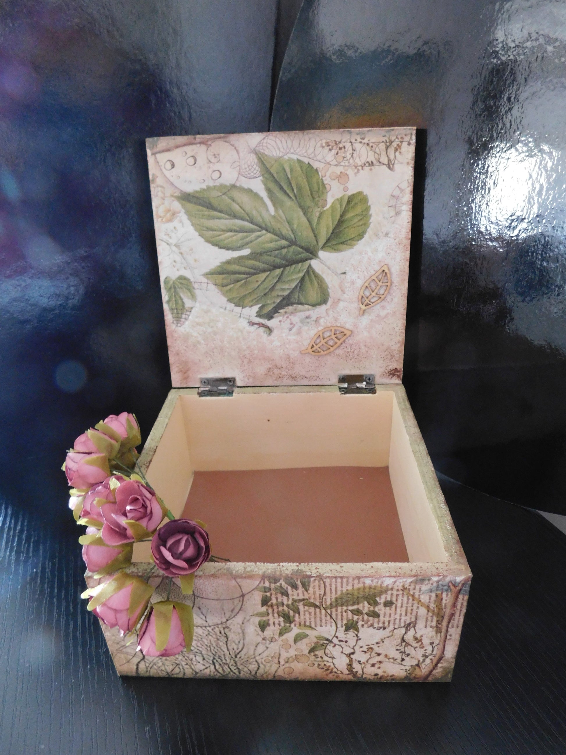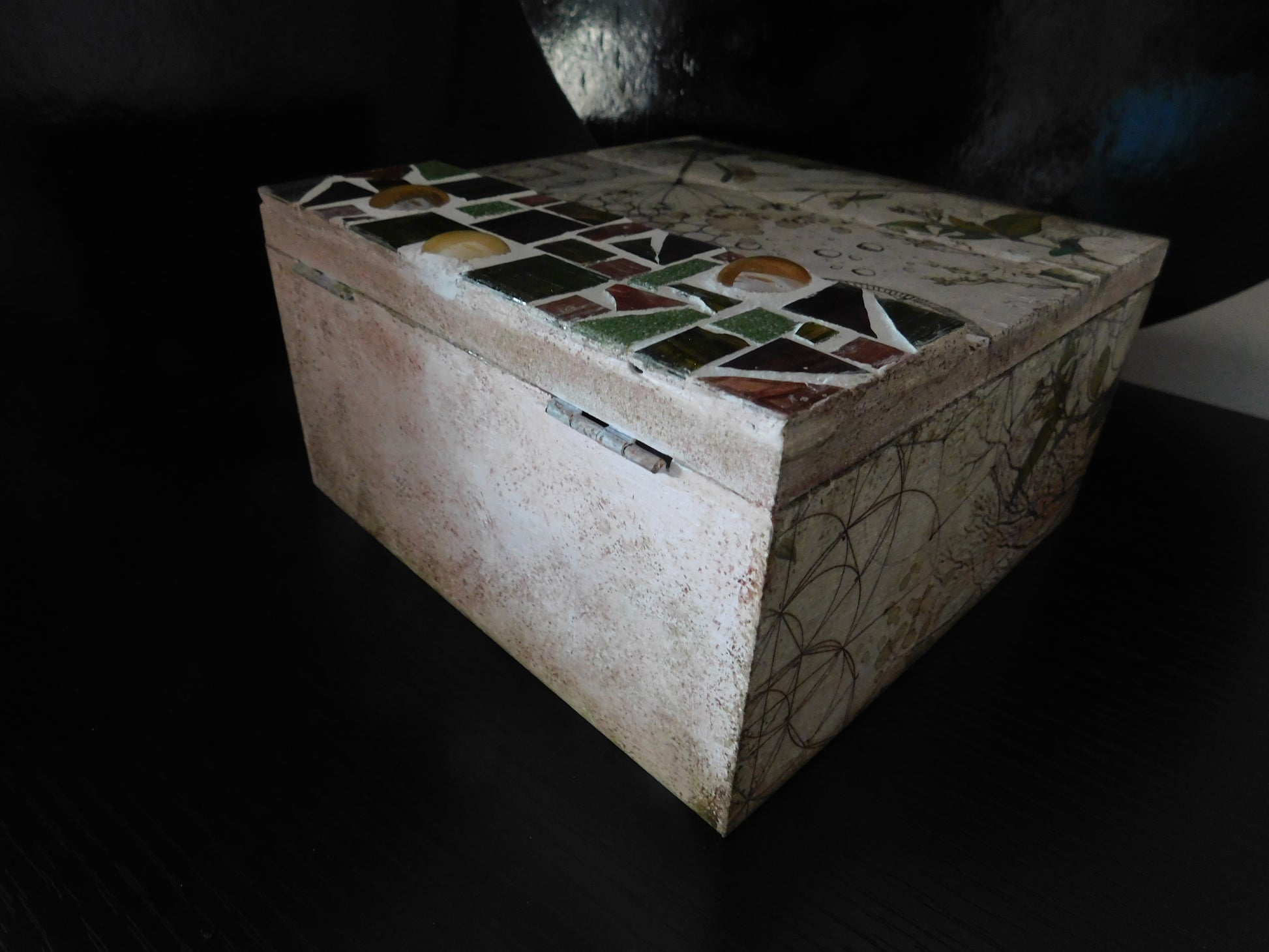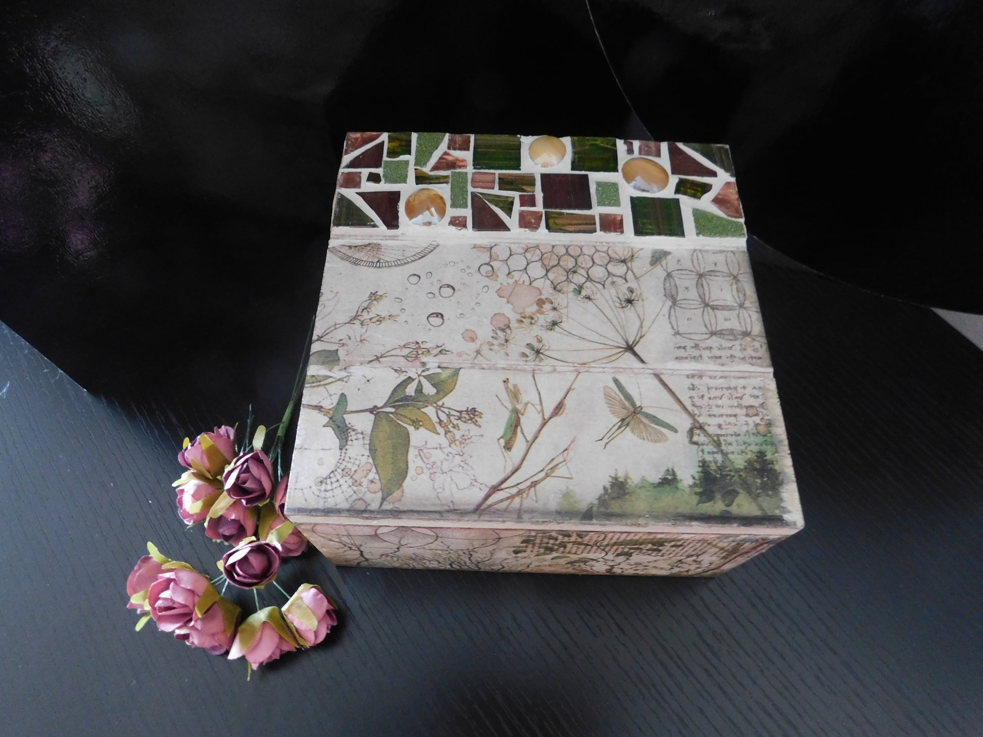 What makes this small wooden box unique, is the small decoration with mosaics. No dividers inside. Removable brown paper pad inside. (Note: Artificial roses shown on the photos are not included).