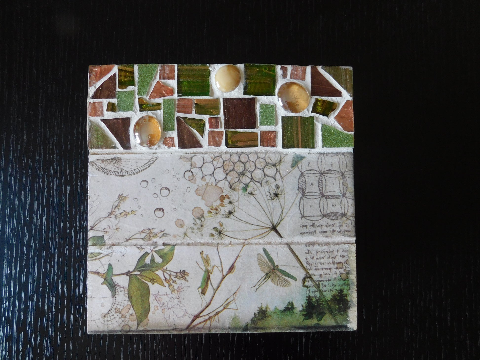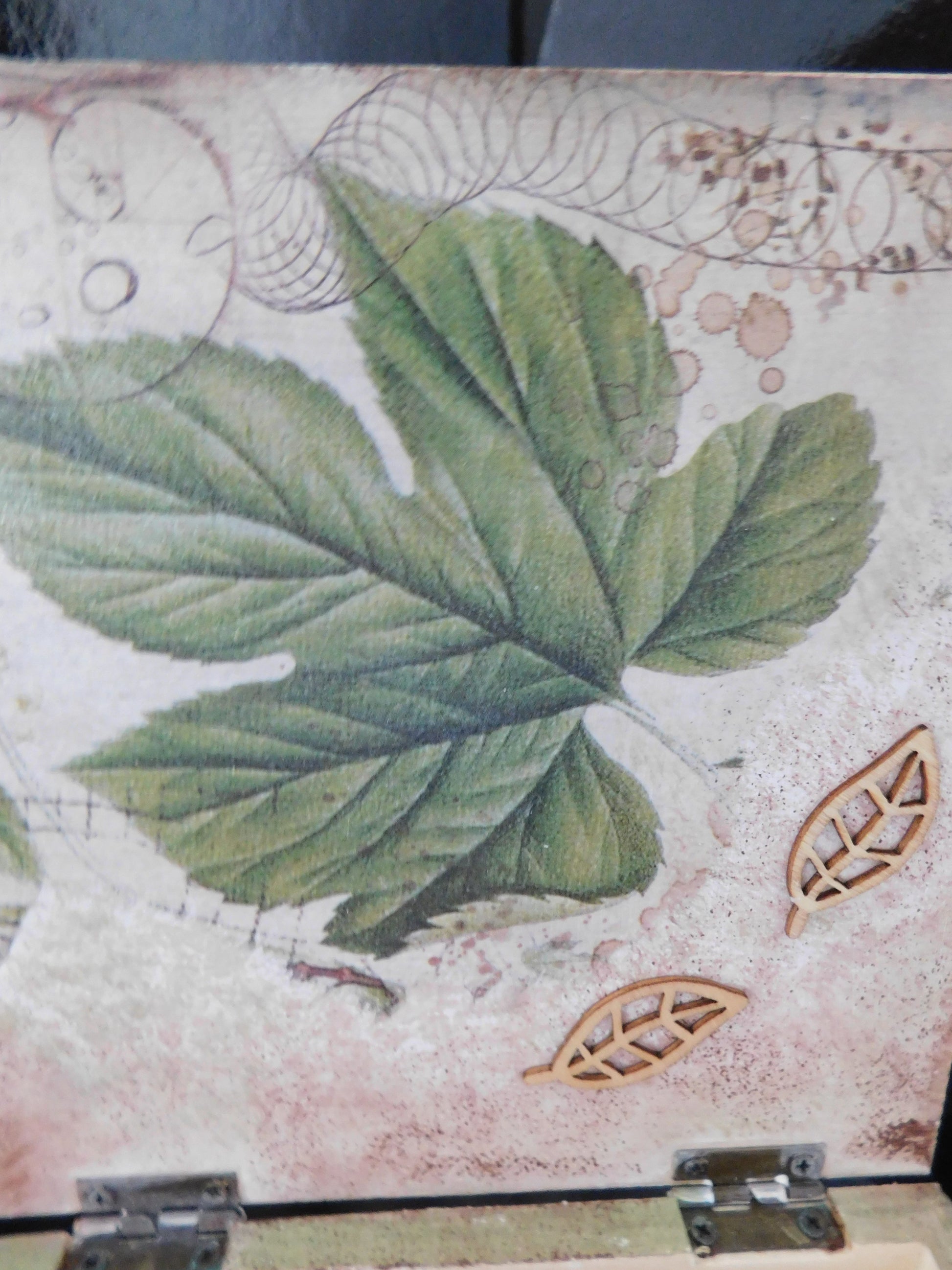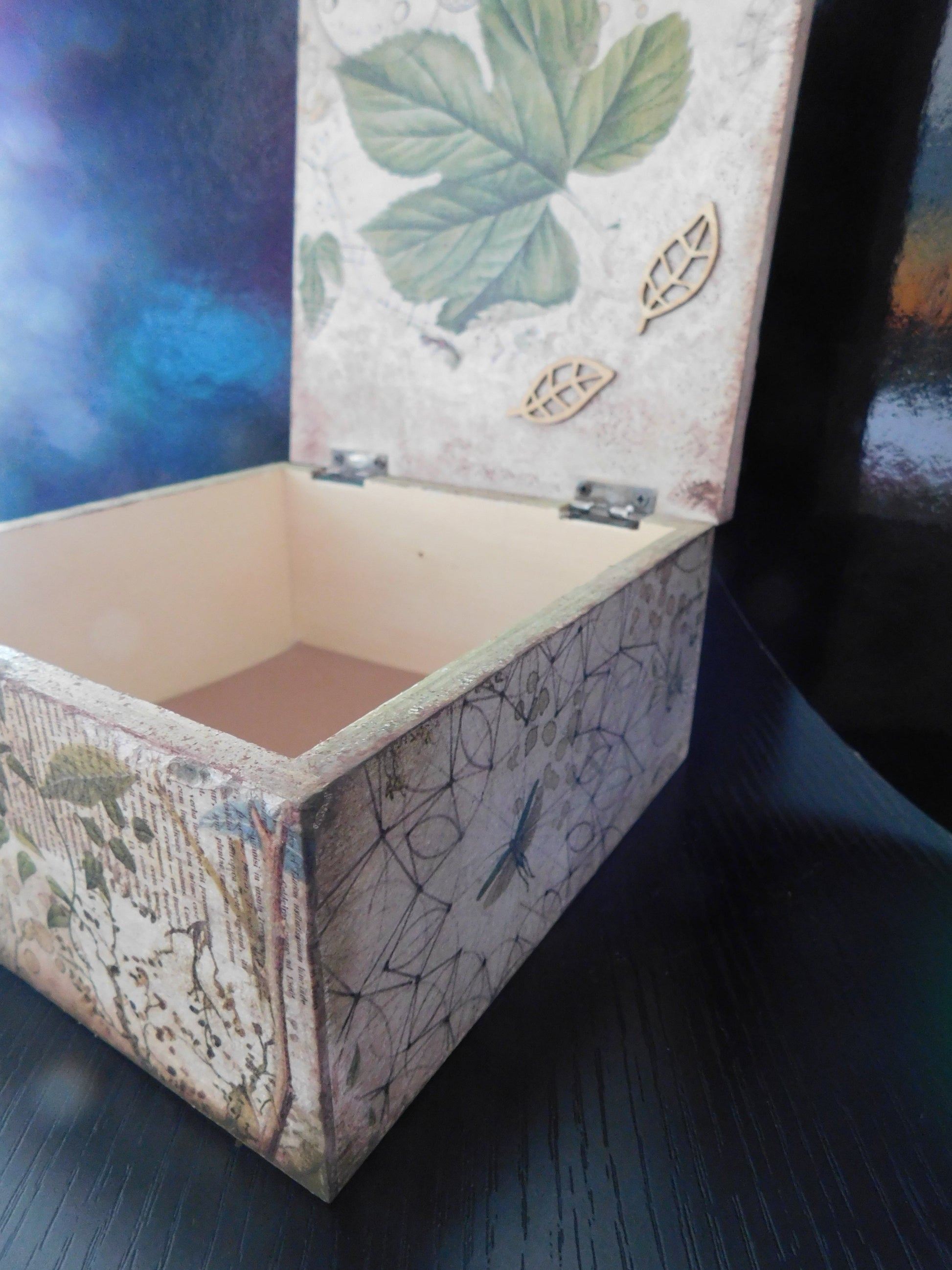 What makes this small wooden box unique, is the small decoration with mosaics. No dividers inside. Removable brown paper pad inside. (Note: Artificial roses shown on the photos are not included).